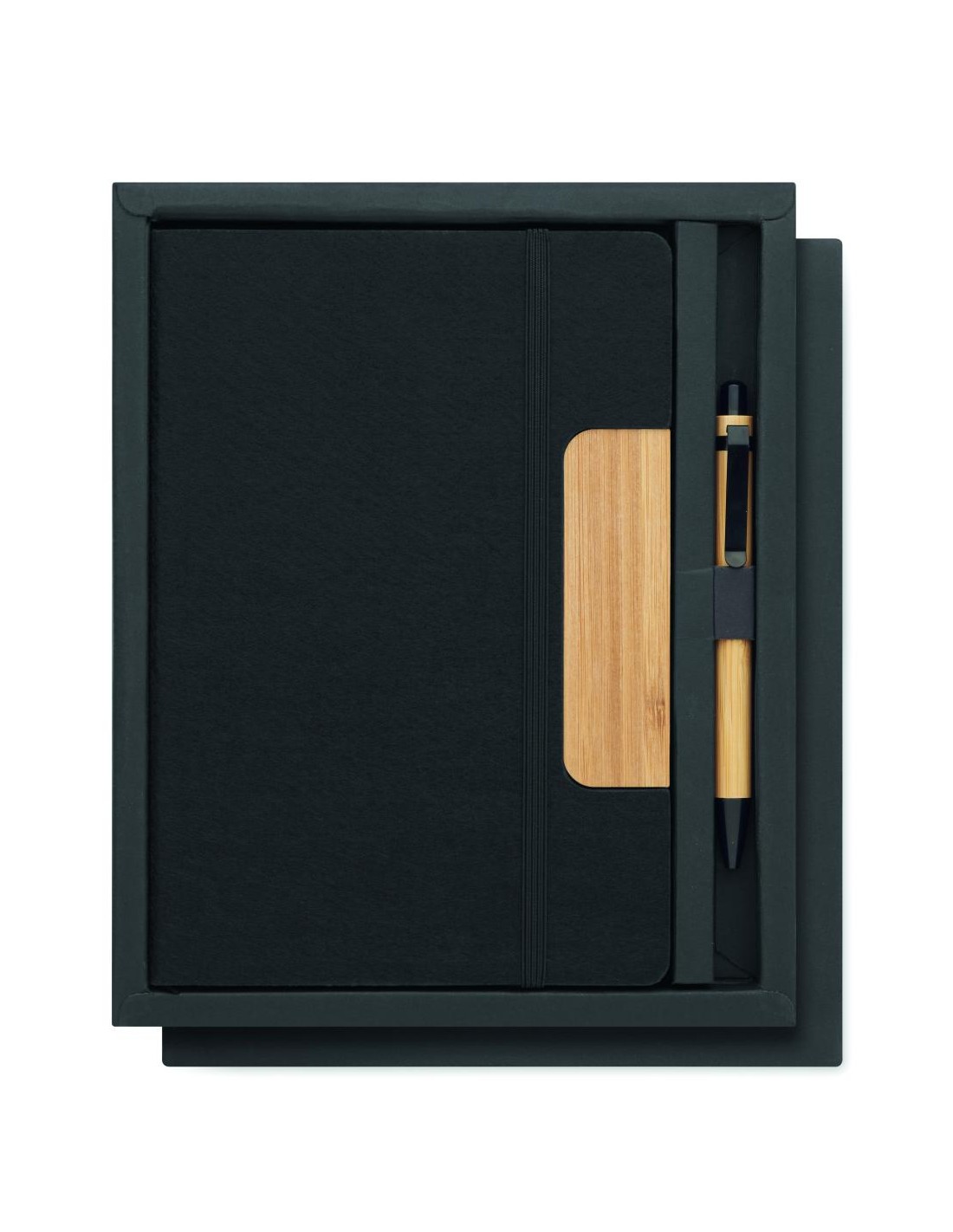 Juego de libretas A5 RPET de fieltro y tapa dura con soporte para teléfono y bolígrafo con cuerpo de bambú. 160 páginas rayadas de papel reciclado (80 hojas). Cinta elástica de cierre. Marcapáginas de cinta. Tinta azul.