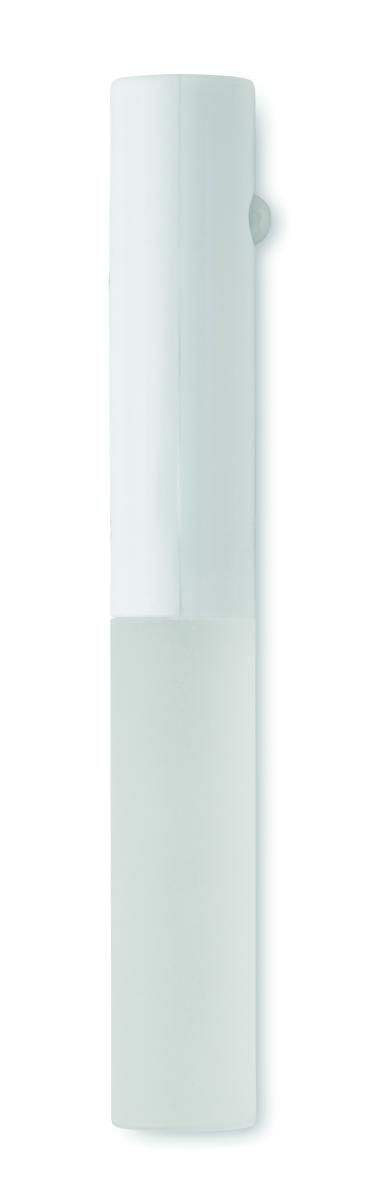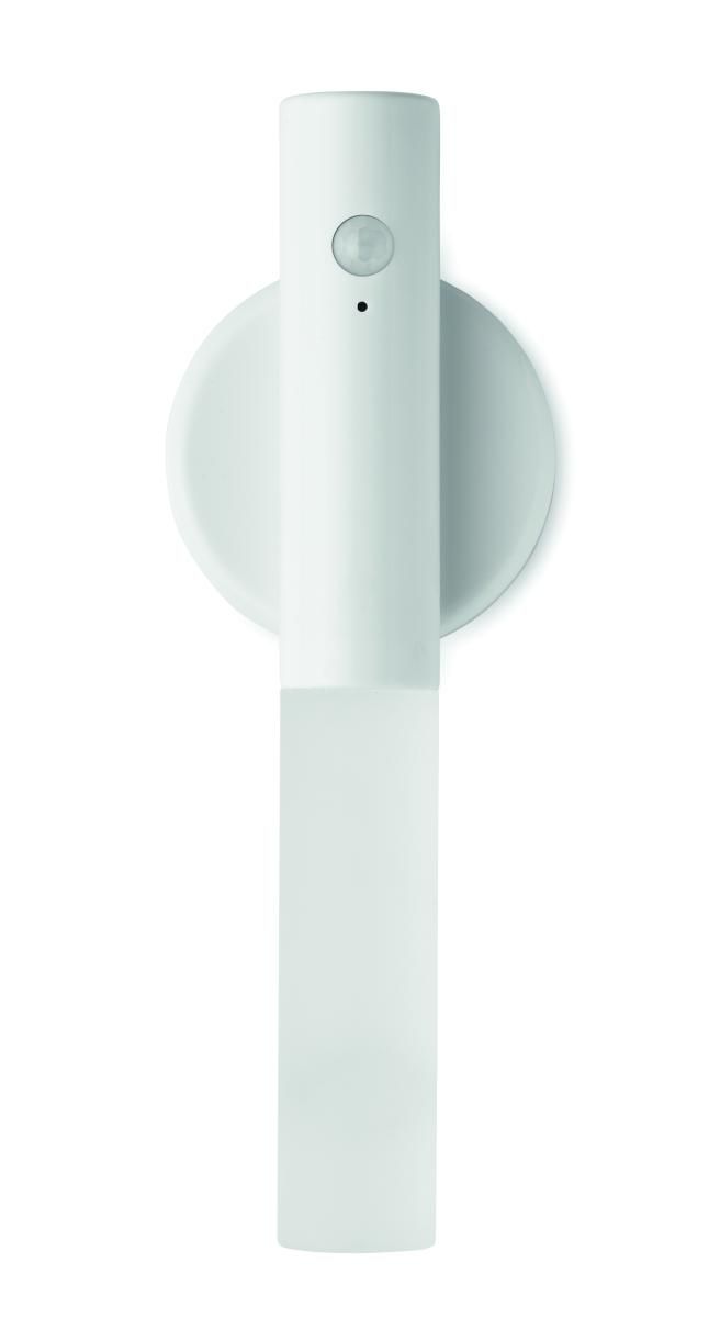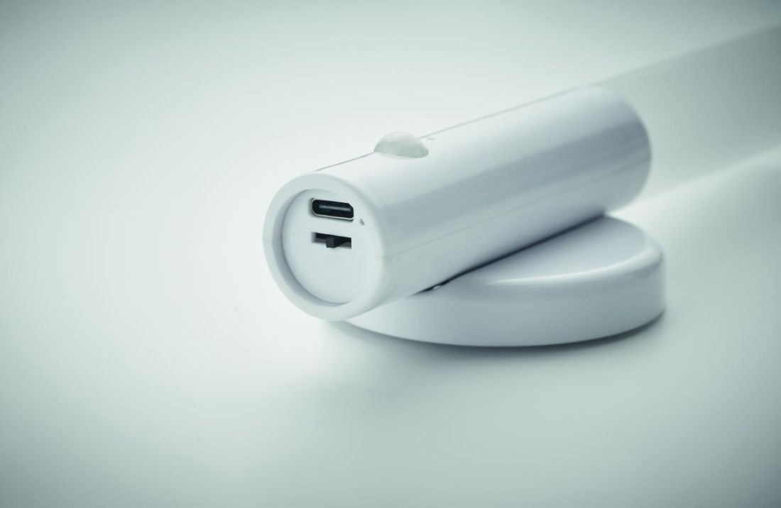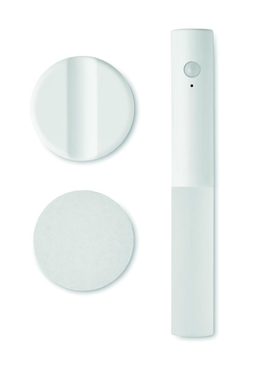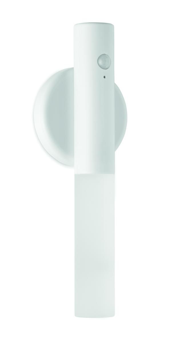 Linterna de emergencia con sensor en ABS y acrílico con base magnética. Batería recargable de 300 mAh incorporada y cable de carga. La base se puede pegar en la pared con el adhesivo 3M incluido.