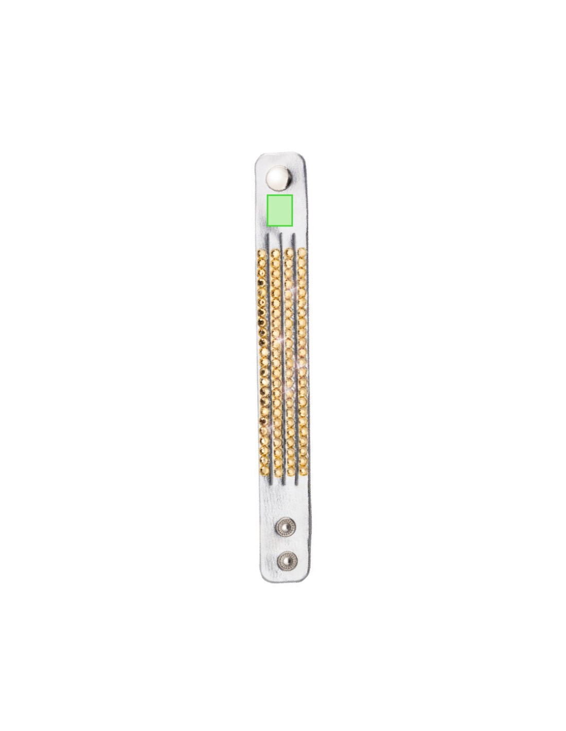 Elegante pulsera de polipiel con incrustaciones brillantea de vivos colores. Con cierre de corchete ajustable.