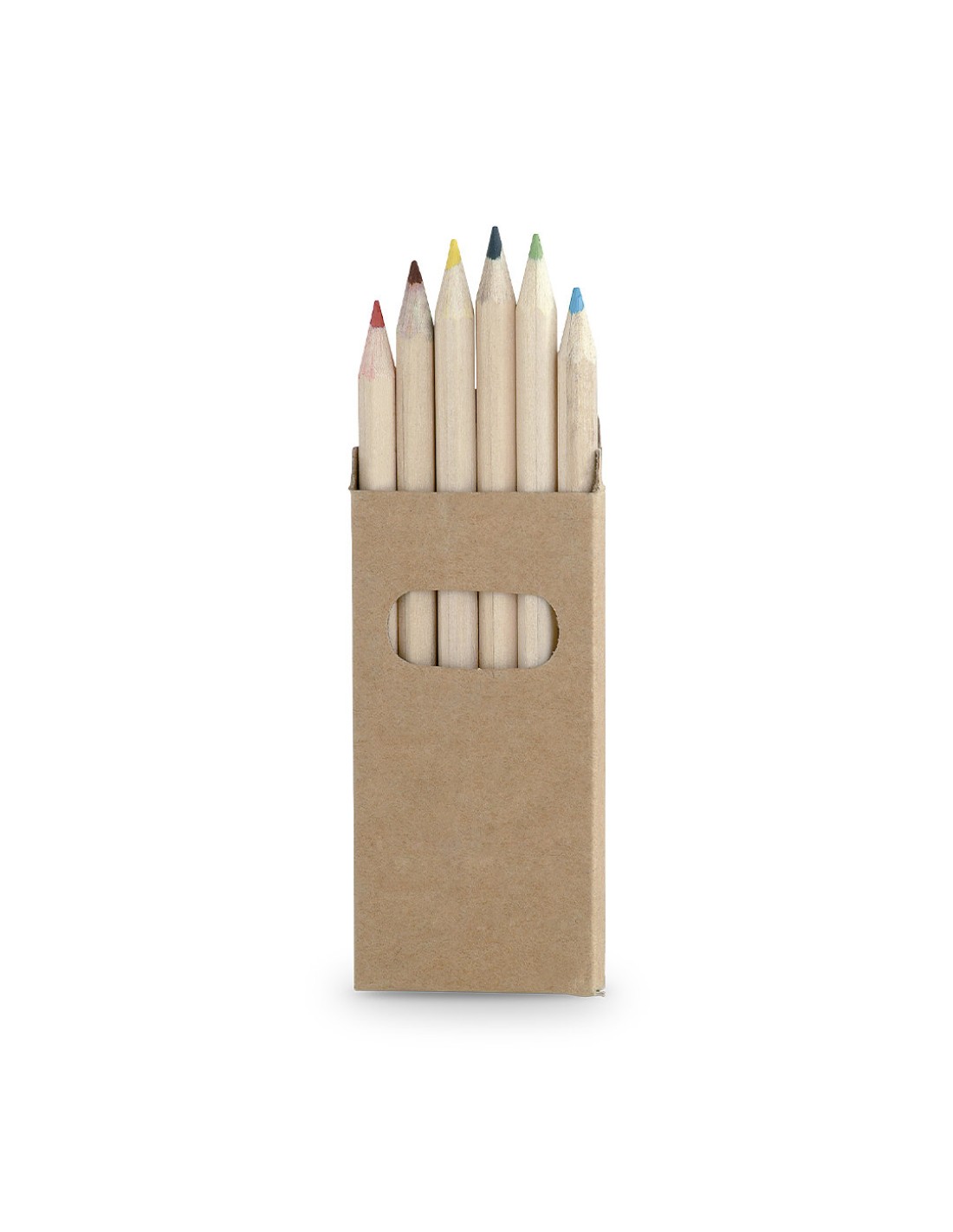 Set de 6 lápices en caja de cartón natural con ventana. Lápices de madera con cuerpo hexagonal de acabado natural y minas en variada gama de colores.