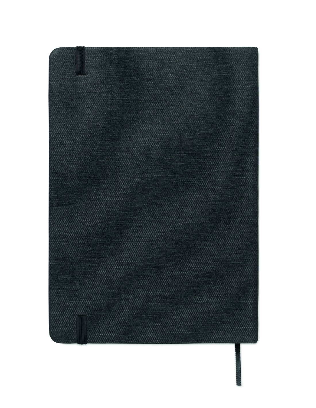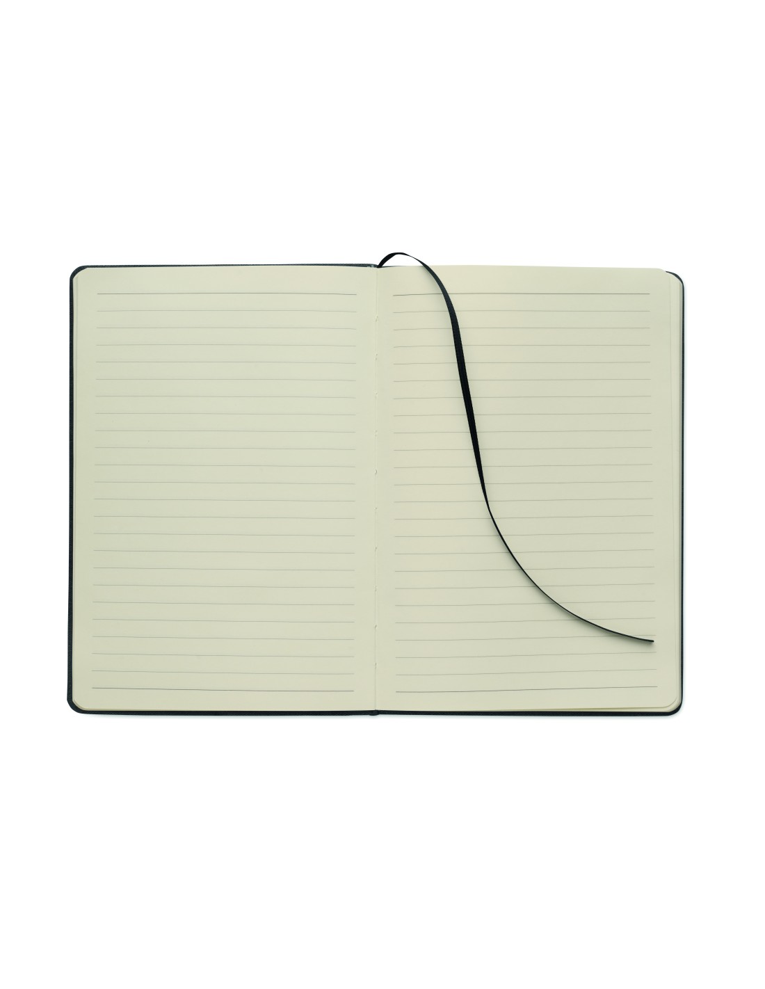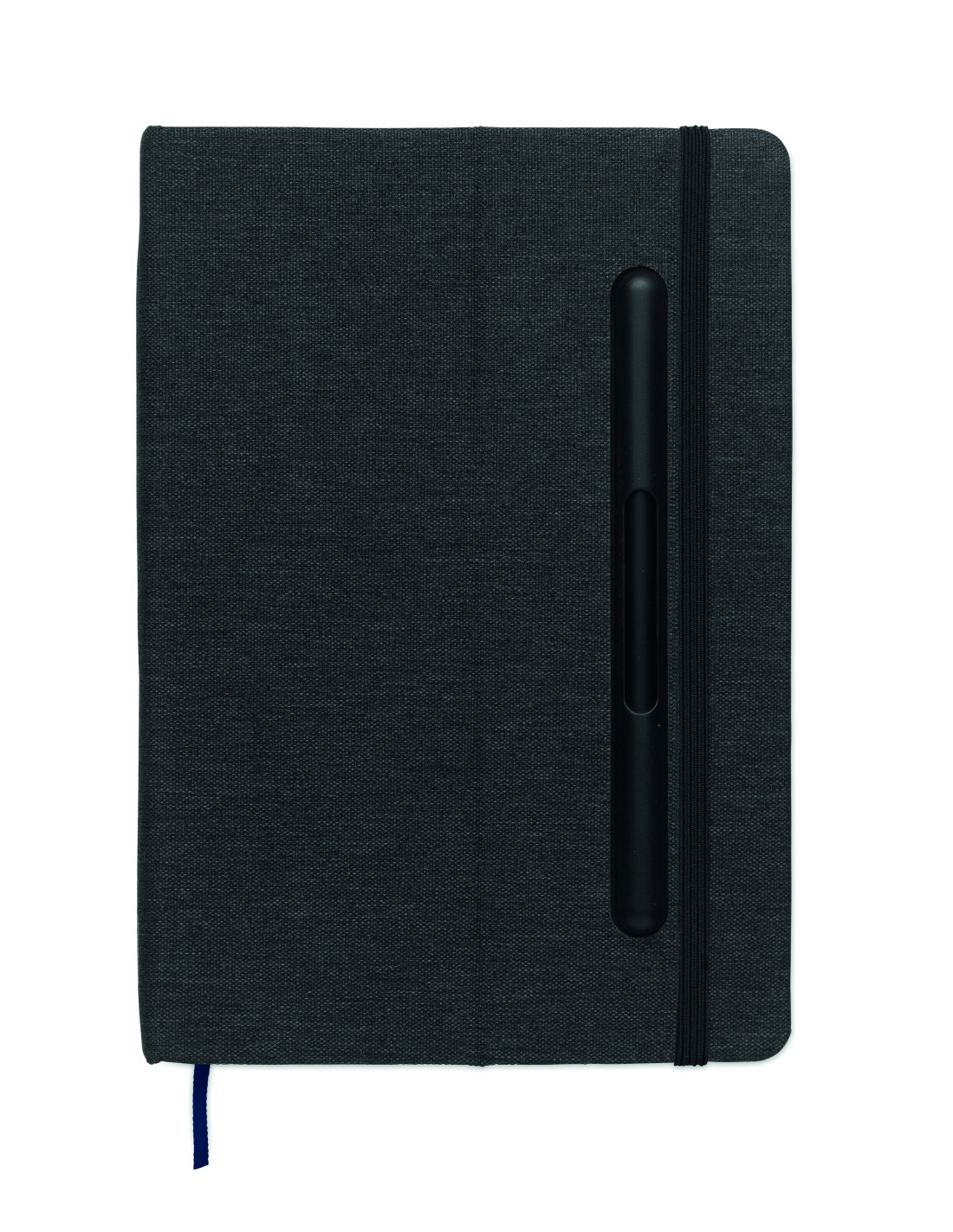 Libreta A5 con tapa dura de RPET con función de soporte para teléfono. Bolígrafo 2 en 1 integrado, normal y sin tinta, en ABS. 192 páginas rayadas de papel reciclado (96 hojas). Correa y marcapáginas a juego.