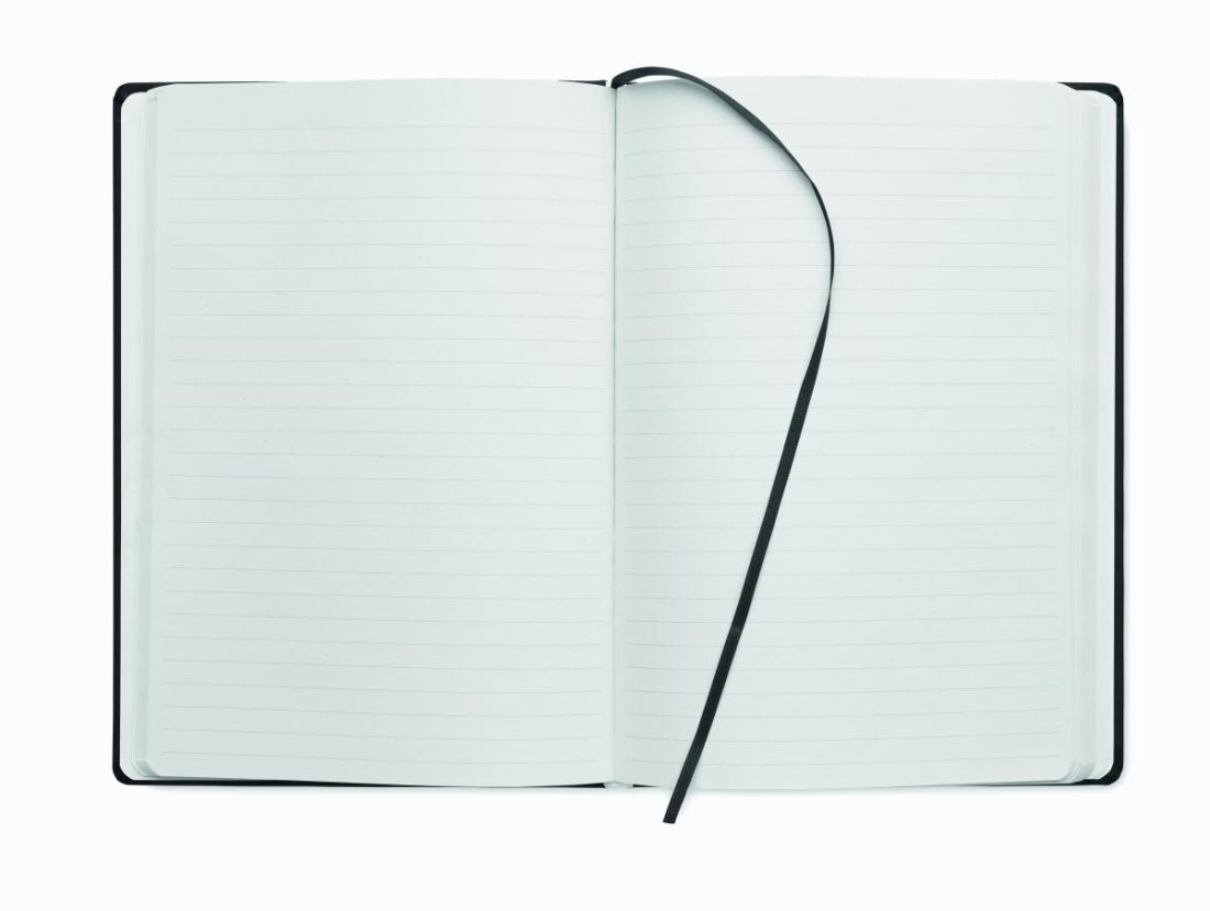 Libreta A5 con tapa rígida de PU. 200 hojas rayadas en papel reciclado (100 g/m²). Banda elástica a juego y marcapáginas. Fabricado en la UE.