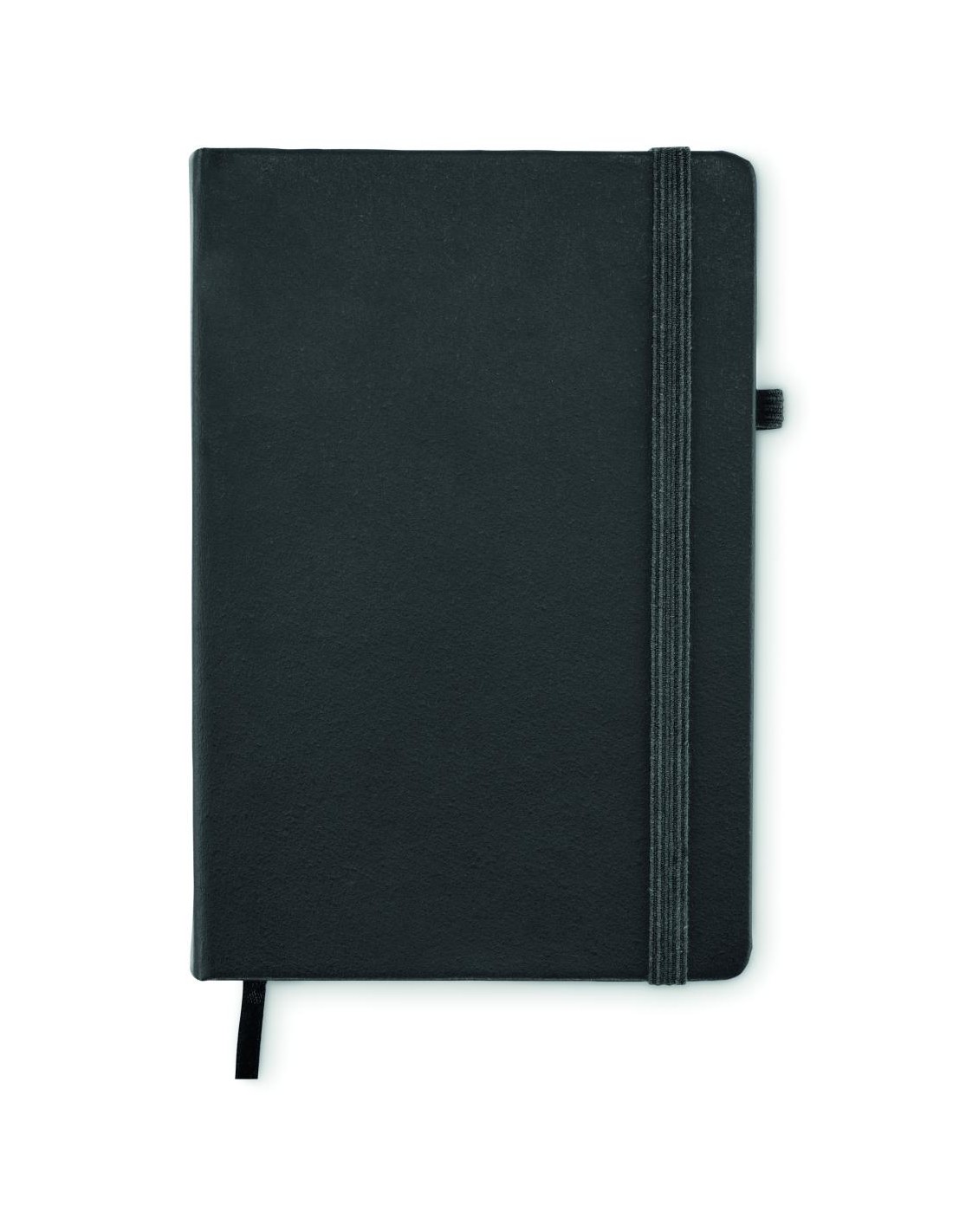 Librera A5 con tapas de 70 % cuero preconsumo reciclado y 30 % PU de látex. Encuadernada. Papel reciclado de 192 páginas rayadas (96 hojas). Cierre de banda elástica y portabolígrafos a juego.
