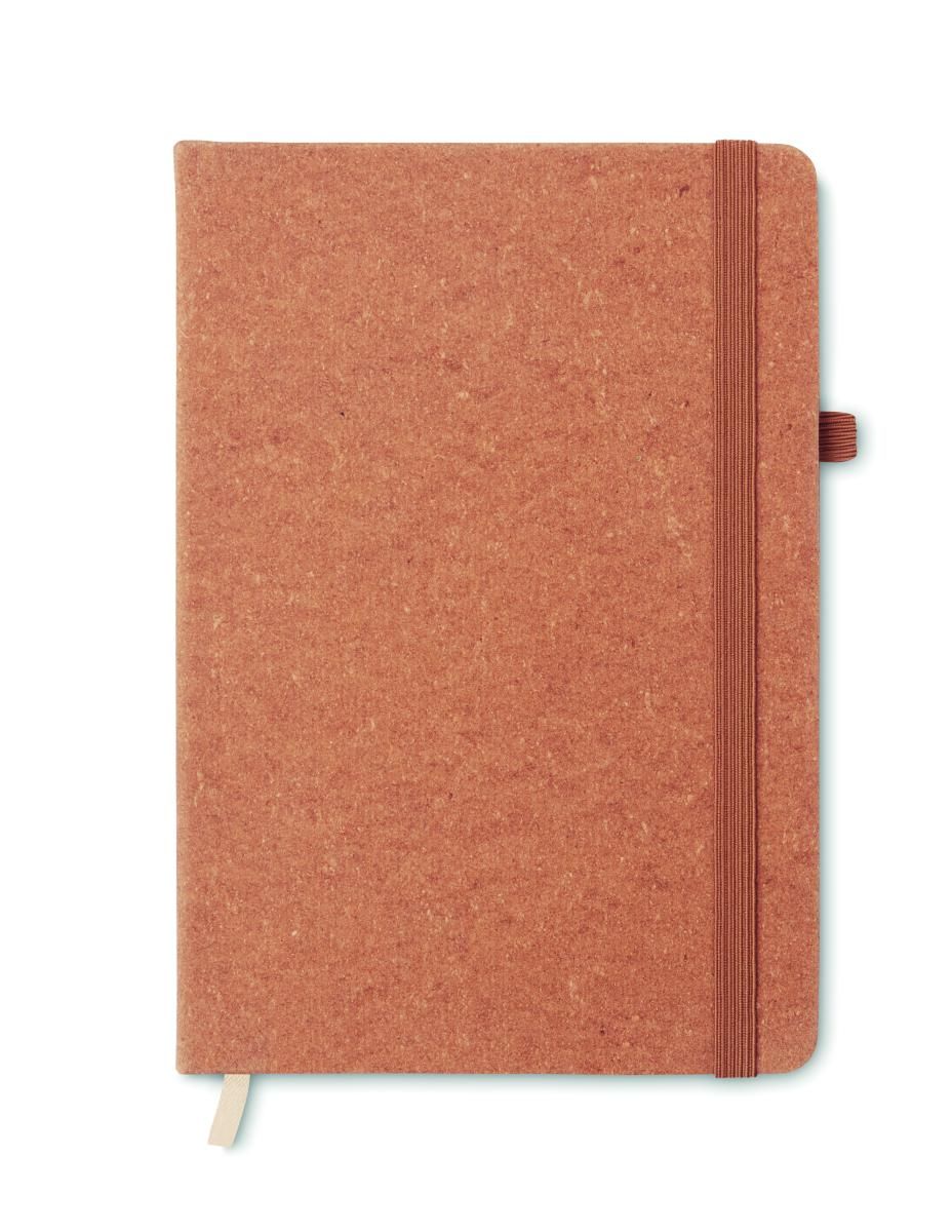 Librera A5 con tapas de 70 % cuero preconsumo reciclado y 30 % PU de látex. Encuadernada. Papel reciclado de 160 páginas rayadas (80 hojas). Cierre de banda elástica y portabolígrafos a juego.