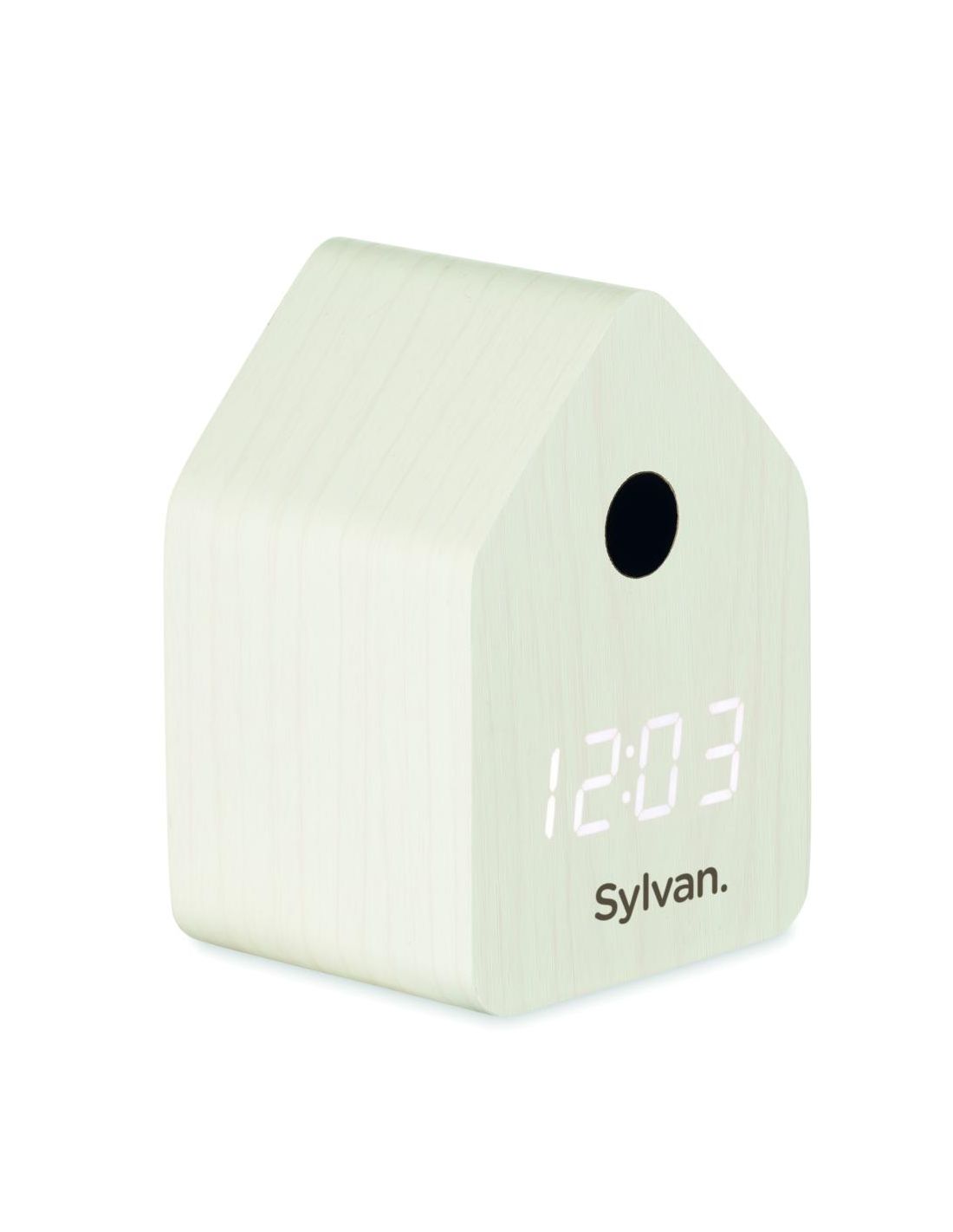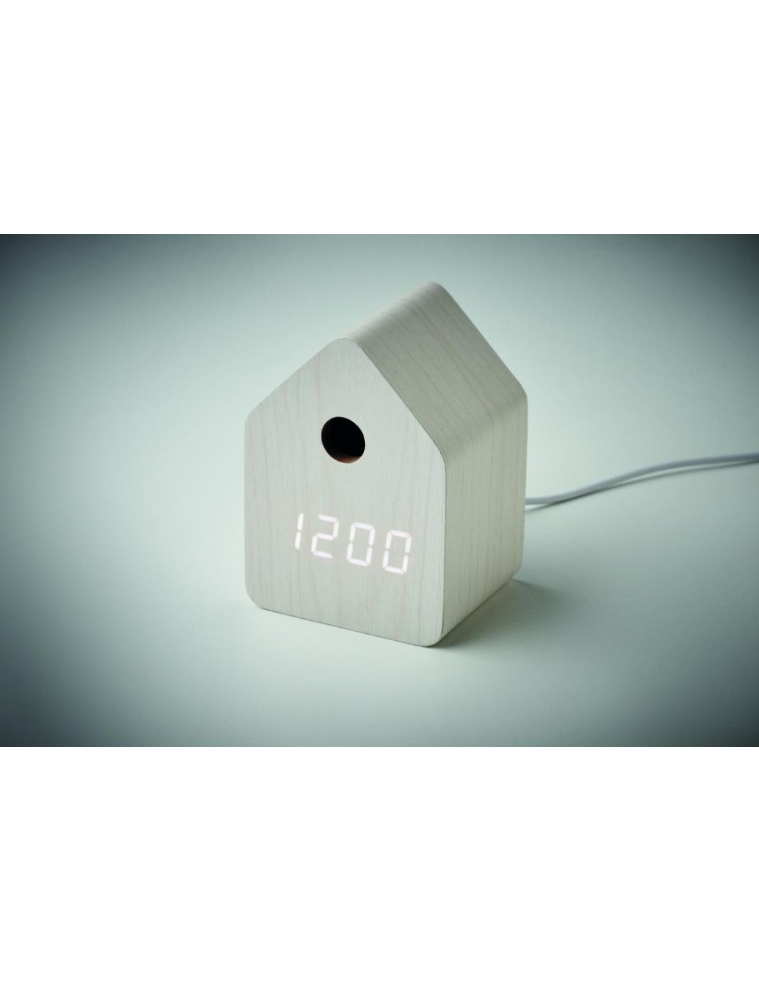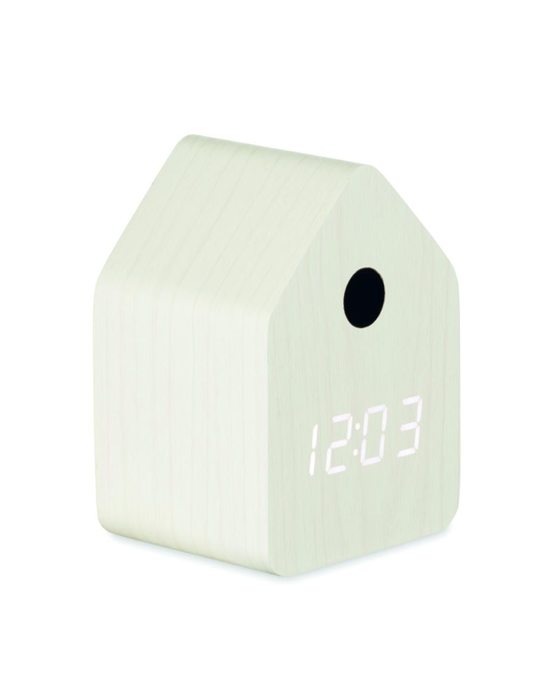 Pequeño reloj de sobremesa de MDF que incluye una alarma integrada con voz de pájaro cuco y visualización de la temperatura. Pantalla LED blanca. E…