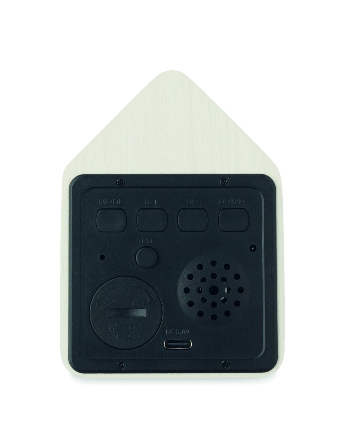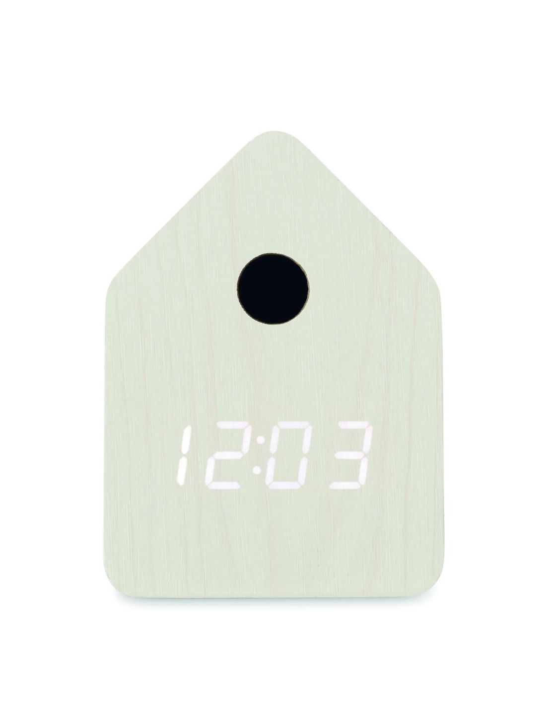 Pequeño reloj de sobremesa de MDF que incluye una alarma integrada con voz de pájaro cuco y visualización de la temperatura. Pantalla LED blanca. El sonido se silencia automáticamente entre las 22.00h y las 06.00h. intervalos de repetición de 5 minutos