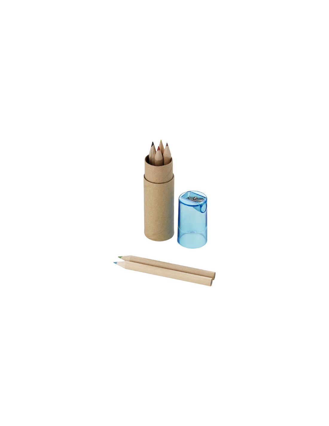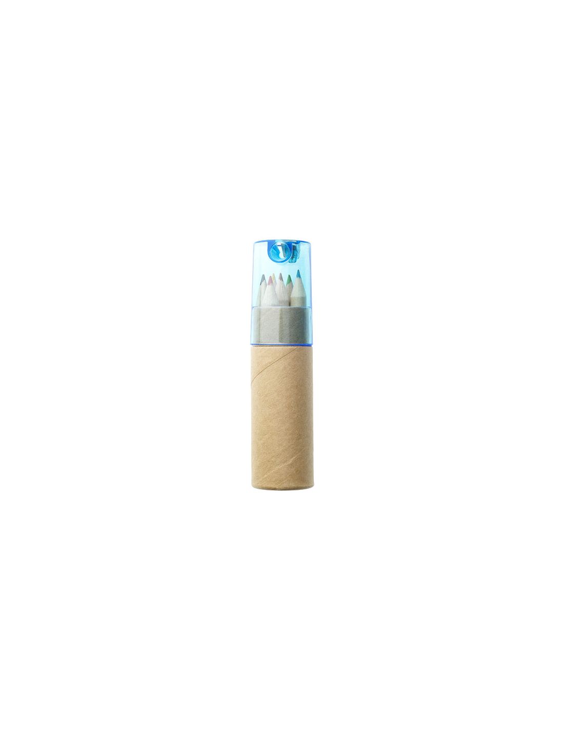 6 lápices de colores en una caja cilíndrica de cartón, con sacapuntas en la tapa de plástico. No permite la grabación de los componentes.