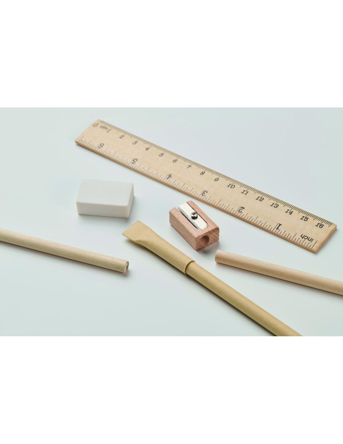 Set de escritura en estuche cilíndrico de papel que incluye 2 lápices, 1 bolígrafo, 1 sacapuntas de madera y 1 goma de borrar.
