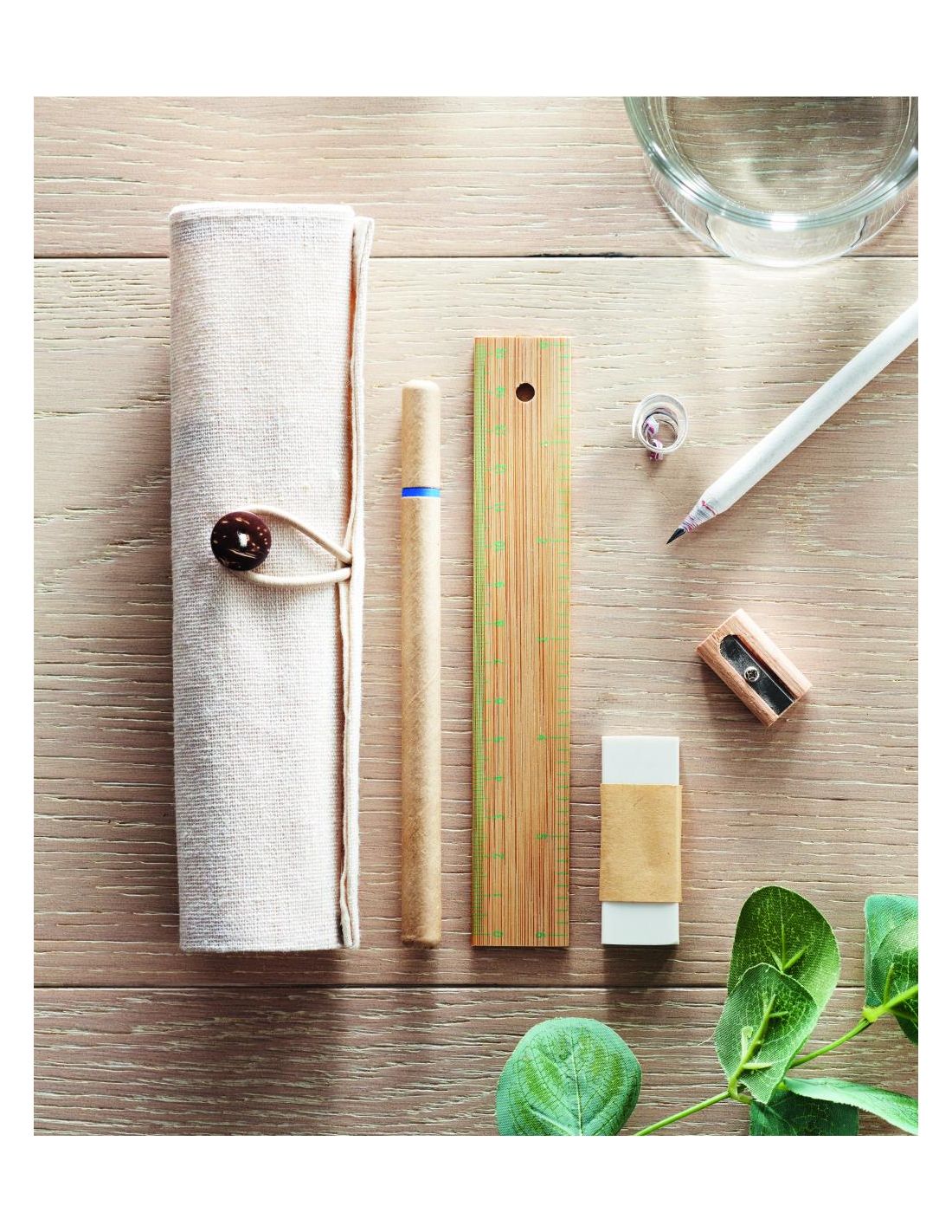 Estuche realizado en yute y algodón que incluye una regla realizada en bambú, un lápiz de papel, un bolígrafo de tinta azul con el cuerpo de cartón…