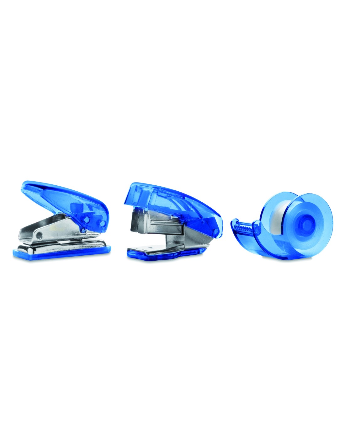 Set de escritorio indispensable. Incluye dispensador de cinta adhesiva, mini grapadora, 300 grapas, perforador de 1 agujero y cinta adhesiva de recambio. Presentado en estuche de plástico translúcido.