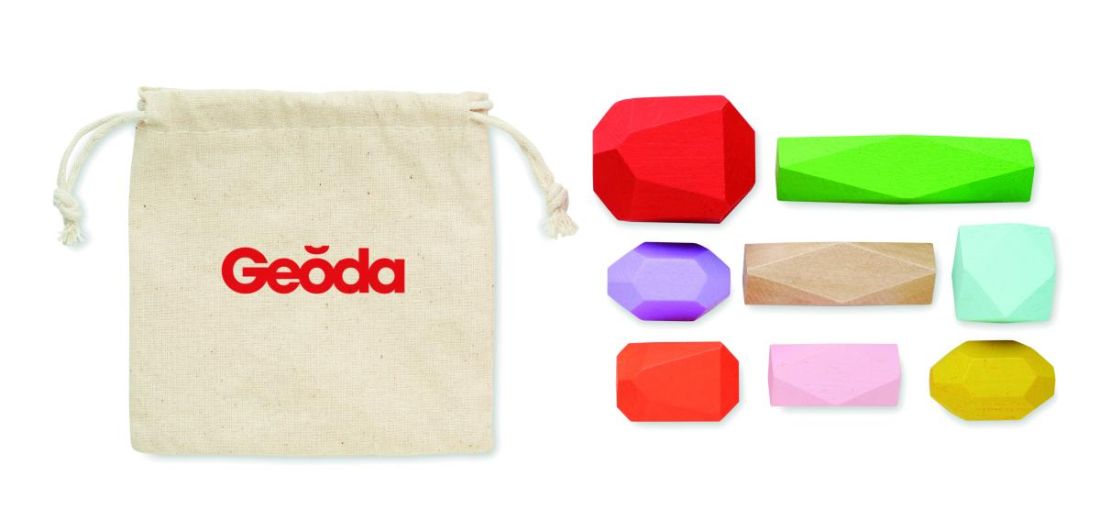 Juego de 8 piedras apilables de madera de colores, presentado en bolsa de algodón.