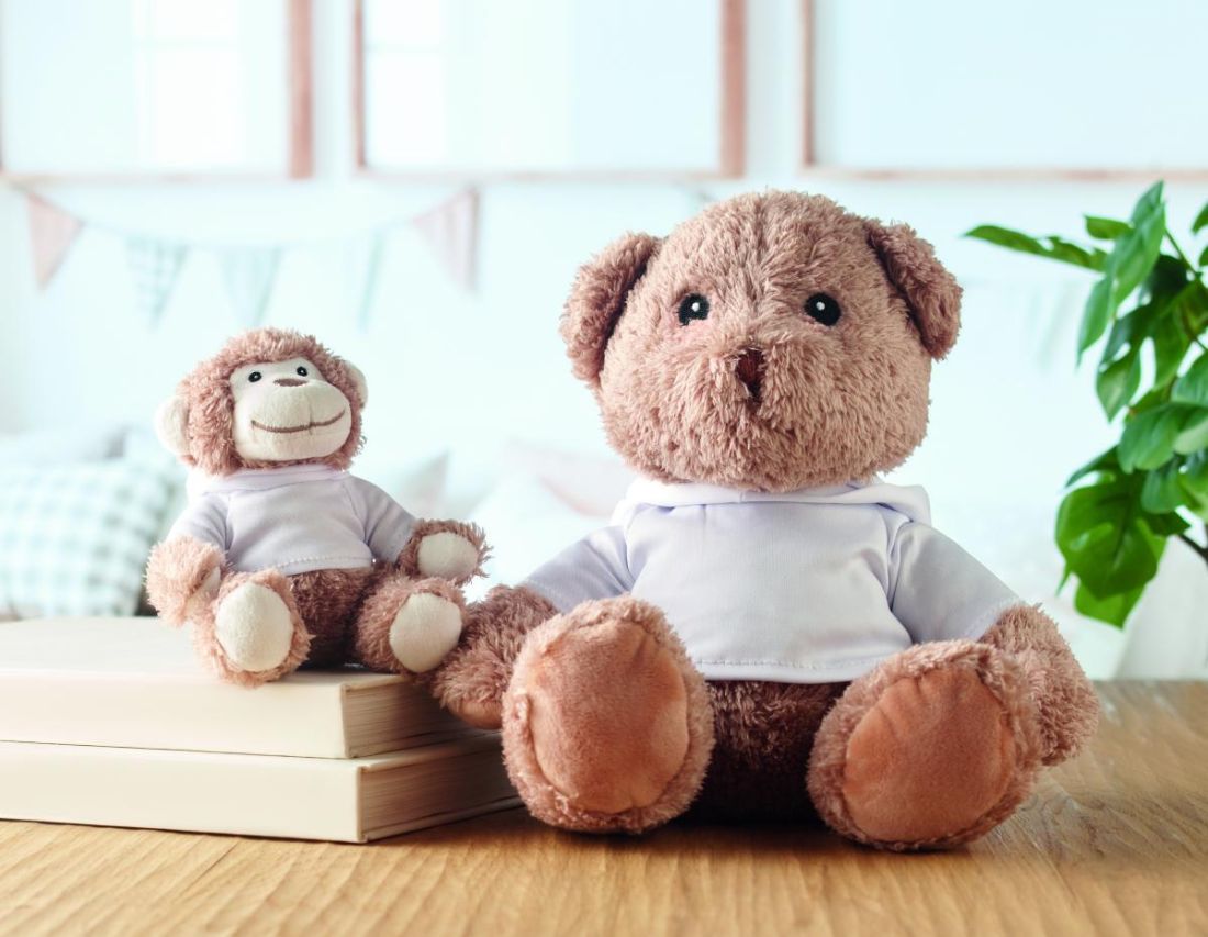 Osito de peluche grande que lleva una sudadera con capucha. Ideal para la impresión en sublimación.