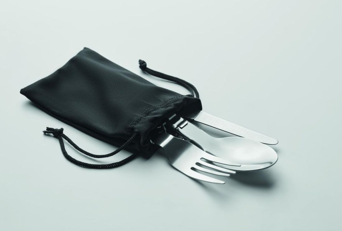 Juego de cubiertos de 3 piezas de camping en acero inoxidable en bolsa de RPET.