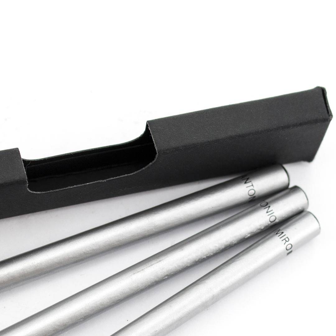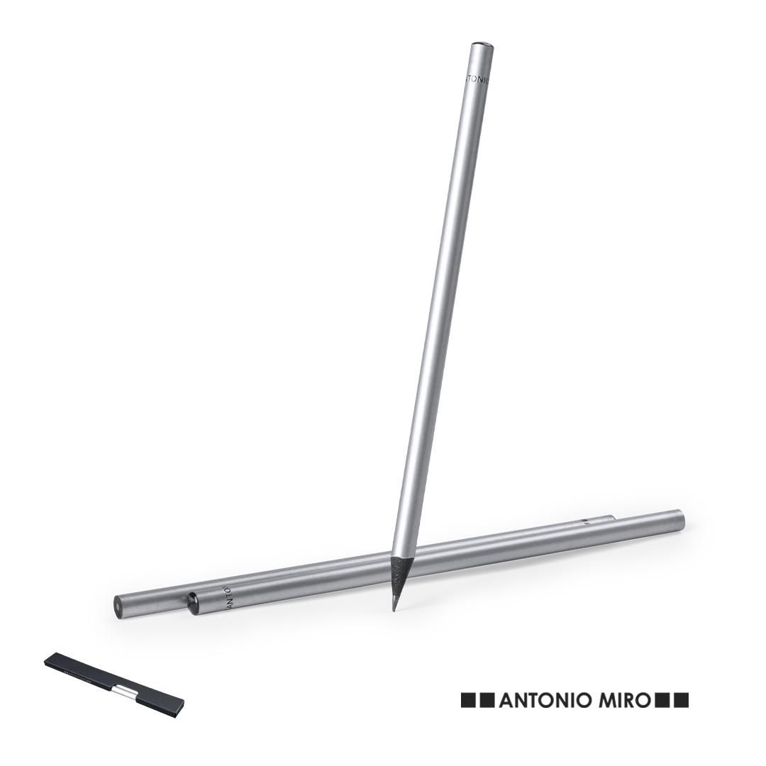Set de 3 lápices de madera de Antonio Miró en elegante acabado plateado, con logotipo de la marca en parte superior. Presentados en elegante estuche de cartón negro con ventana y logotipo de la marca.