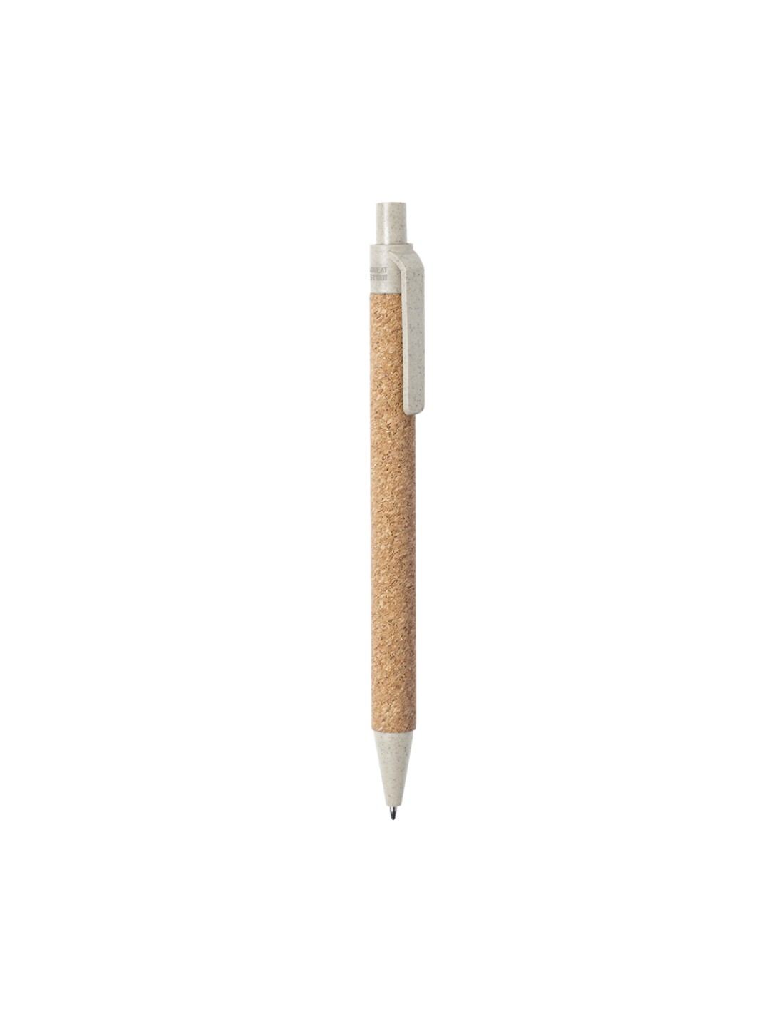 Bolígrafo de línea nature con mecanismo pulsador. Combinación de cuerpo en corcho natural y accesorios en caña de trigo y ABS , para así fomentar la utilización y reciclado de materias primas, reduciendo así las emisiones contaminantes. Disponible en variada gama de colores, con tinta azul. Distintivo Wheat Straw en la parte superior del bolígrafo.