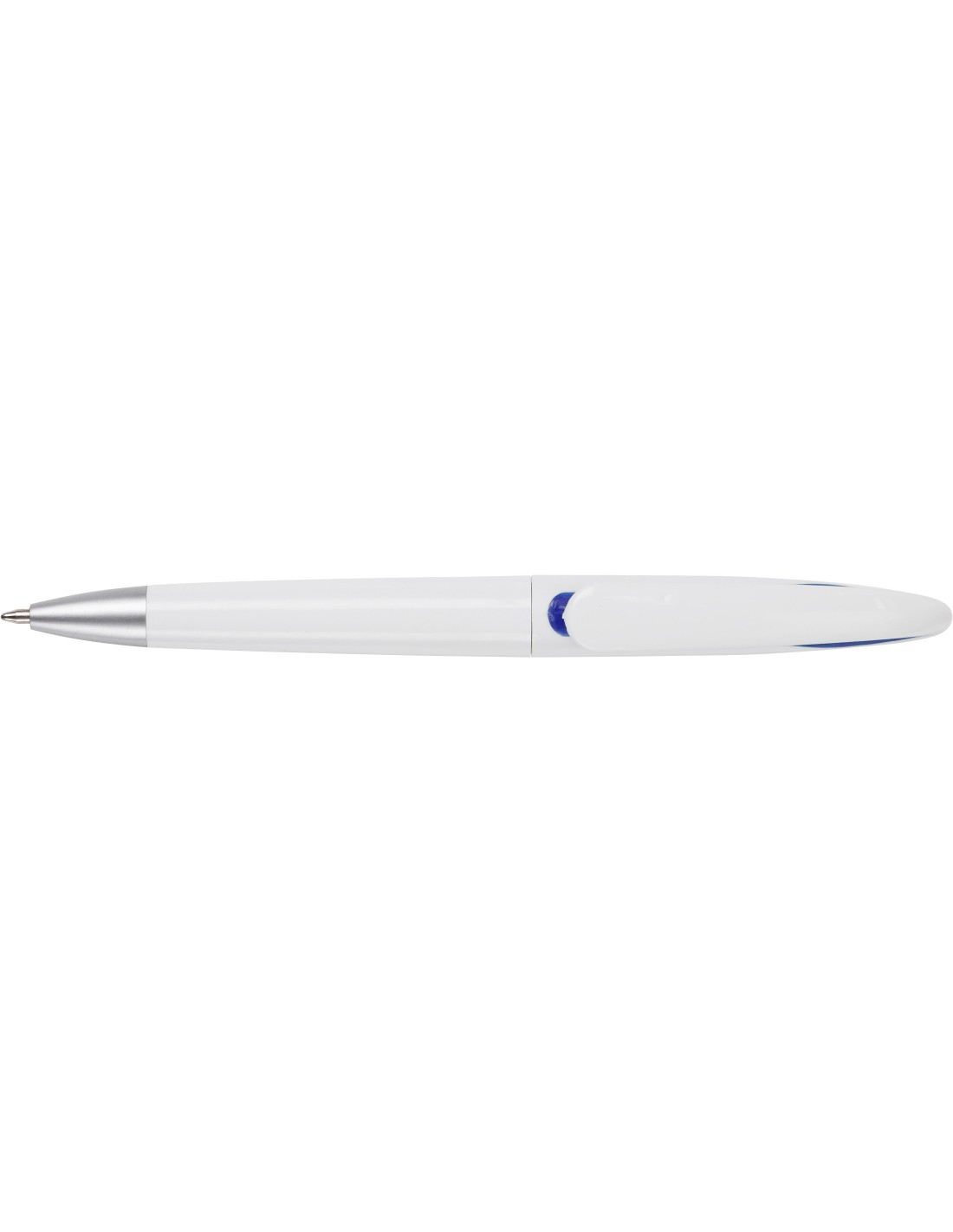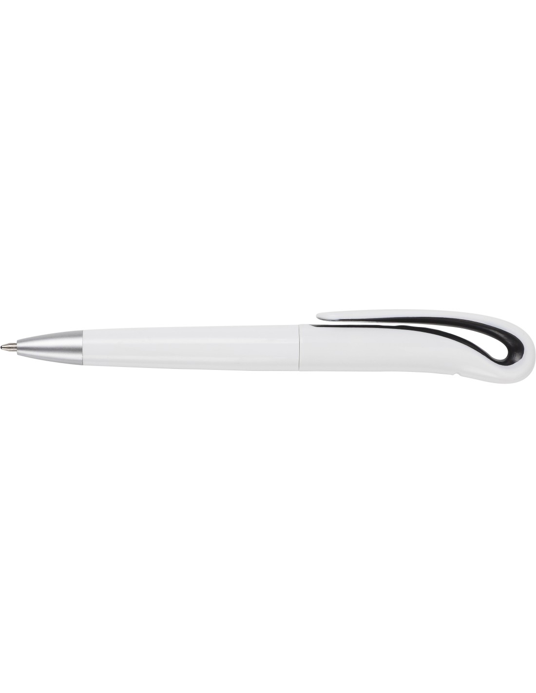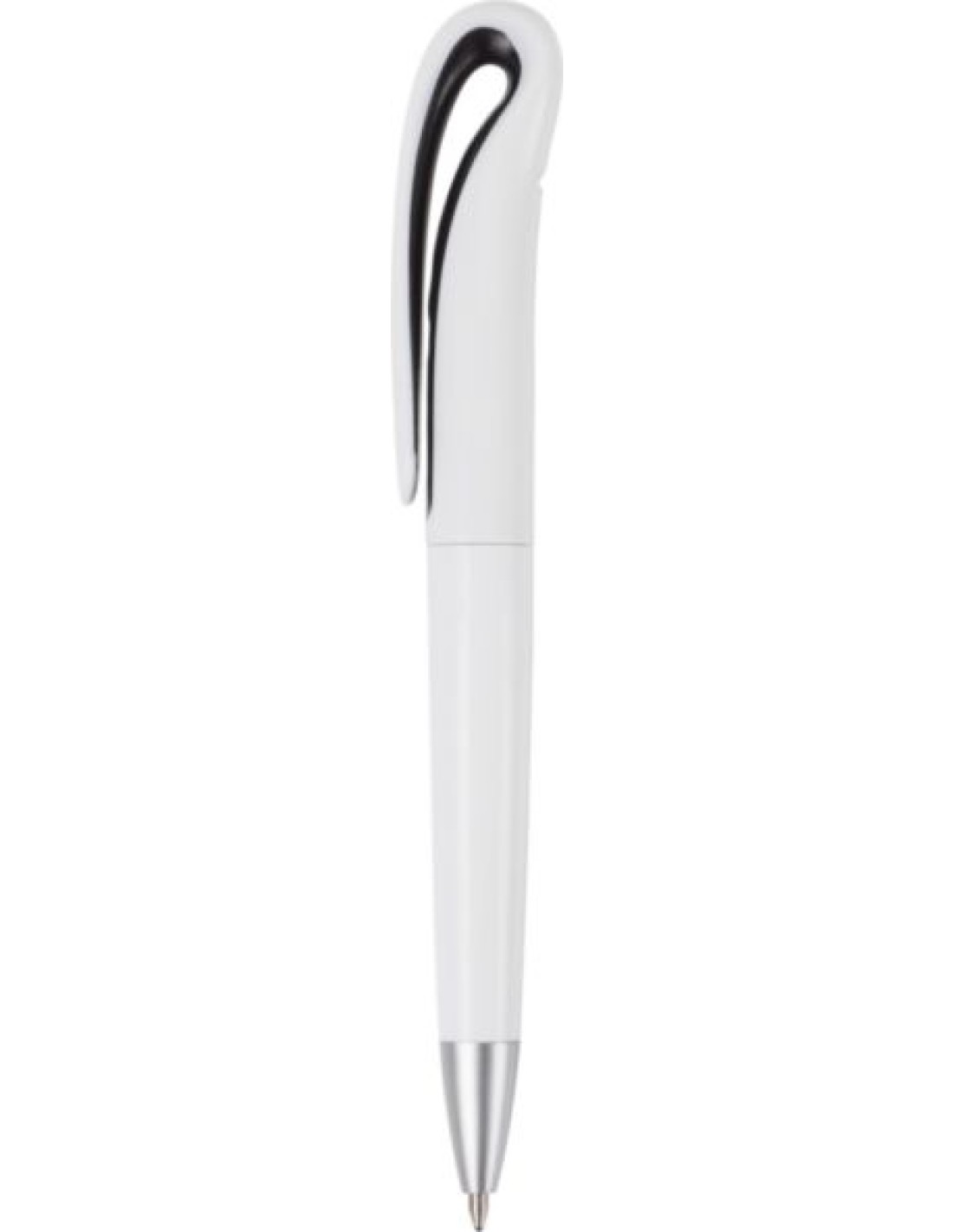 Bolígrafo de ABS blanco con mecanismo de giro, el clip en forma de cuello de cisne. Interior del clip en color y punta en plata. Tinta negra. Artículo registrado.