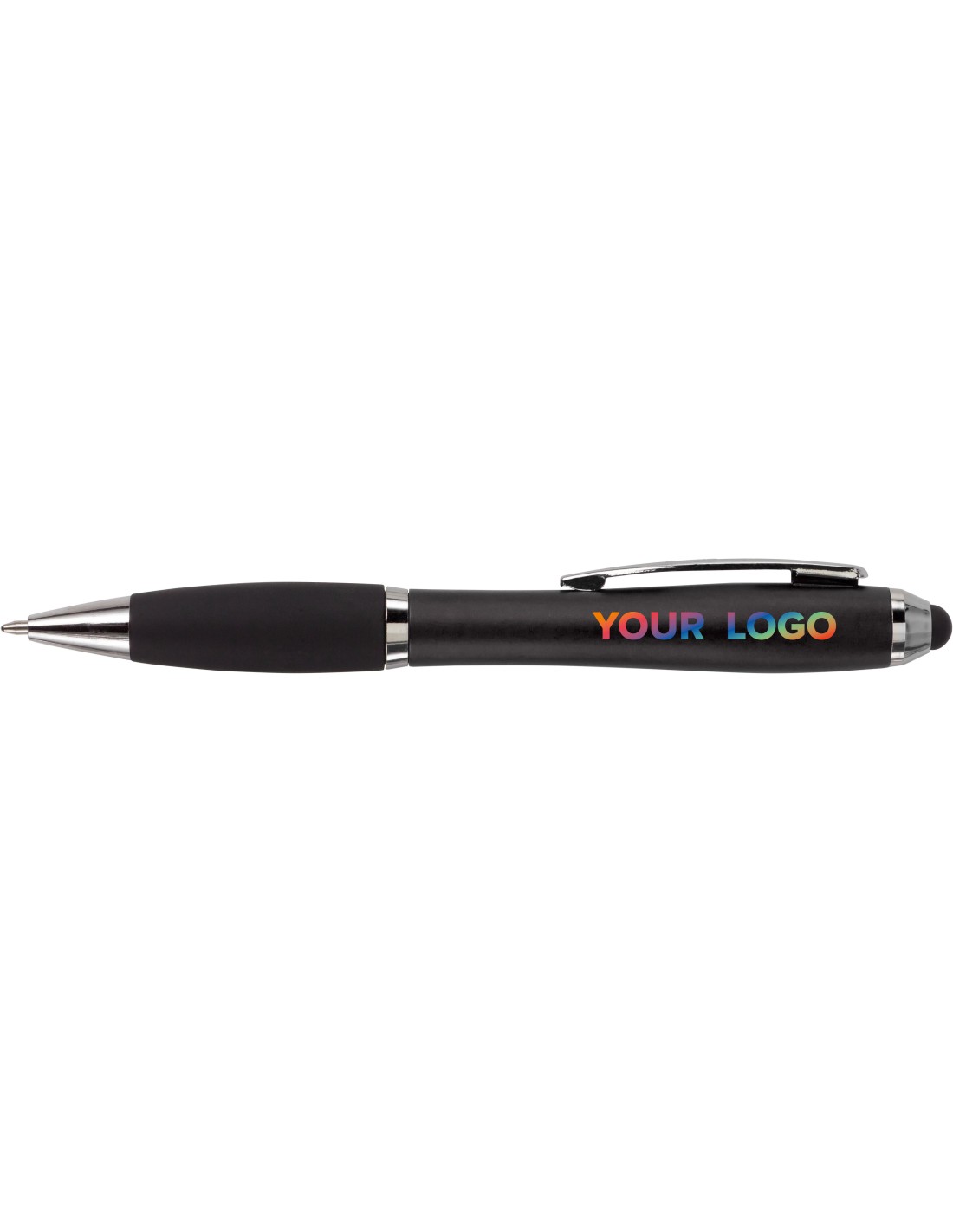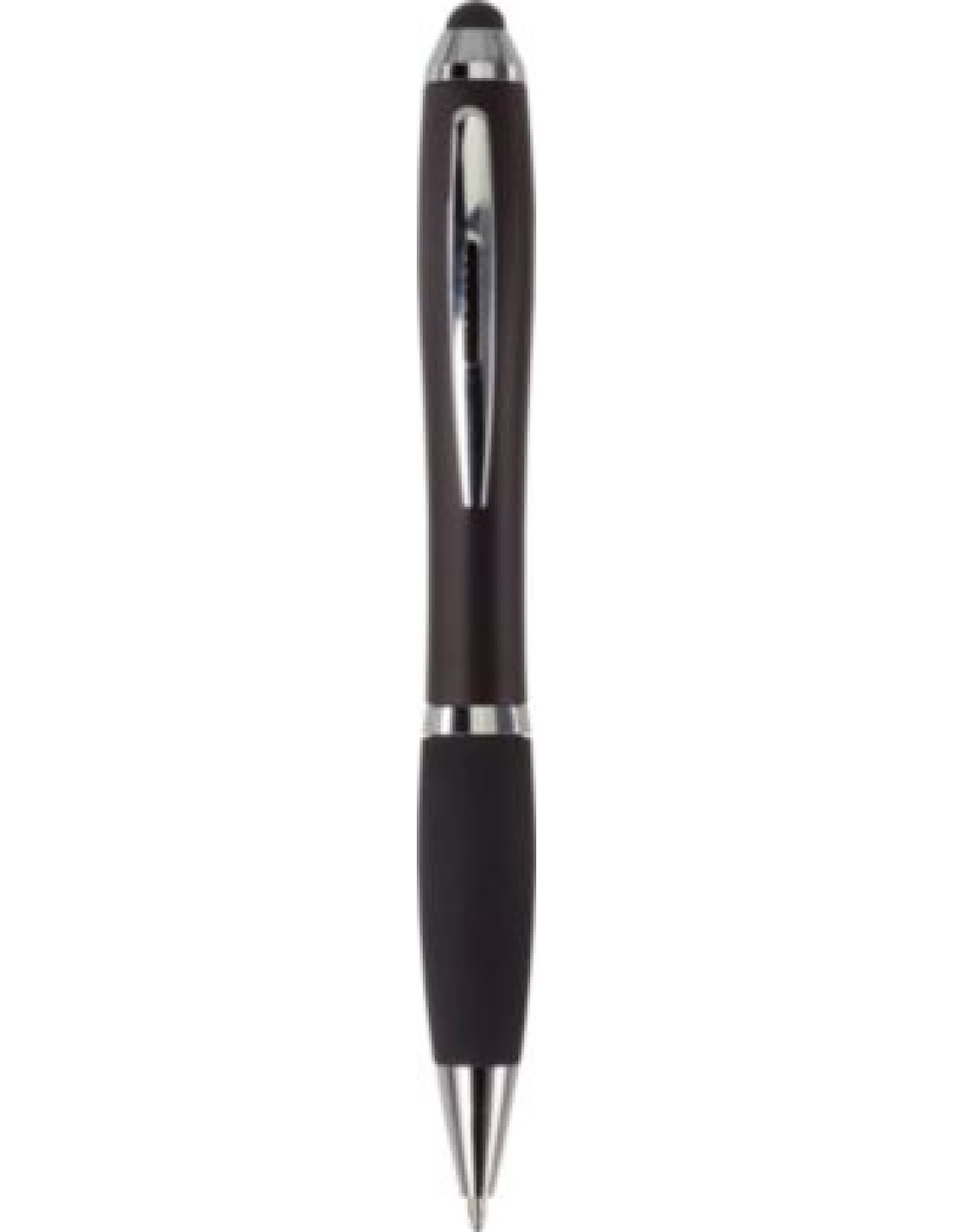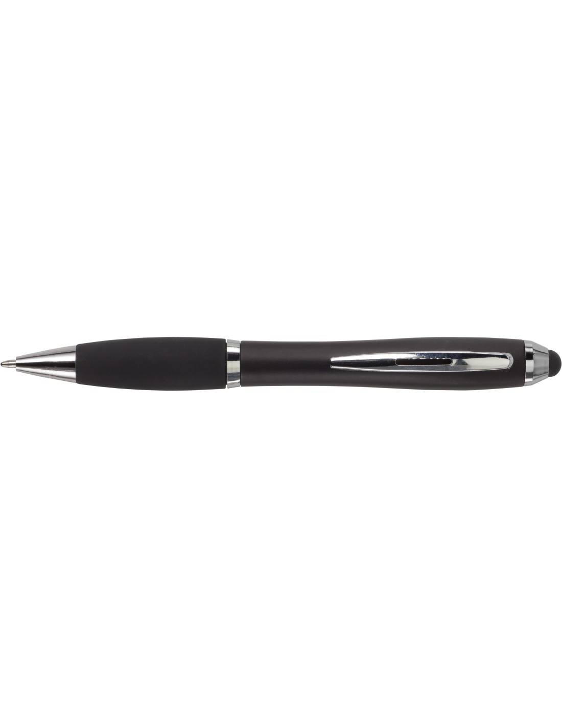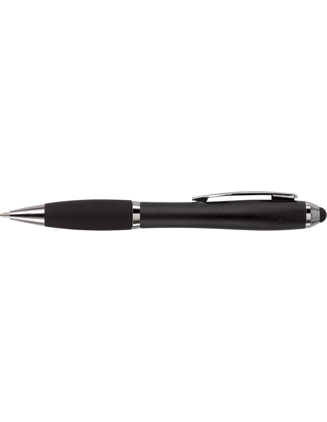 Bolígrafo de ABS con antideslizante de caucho en color negro y puntero táctil. Clip, pulsador y anilla plateados. Tinta negra.