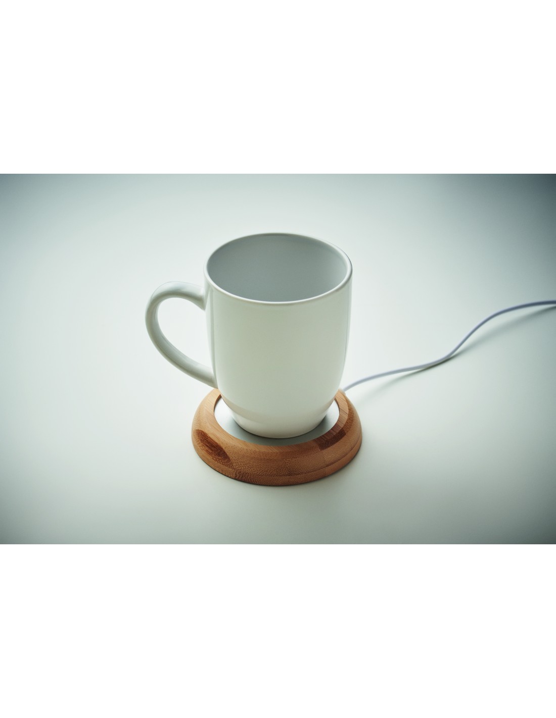 Calentador de tazas de bambú. Mantiene las bebidas calientes hasta un máximo de 45ºC. Dispone de cable de conexión USB.