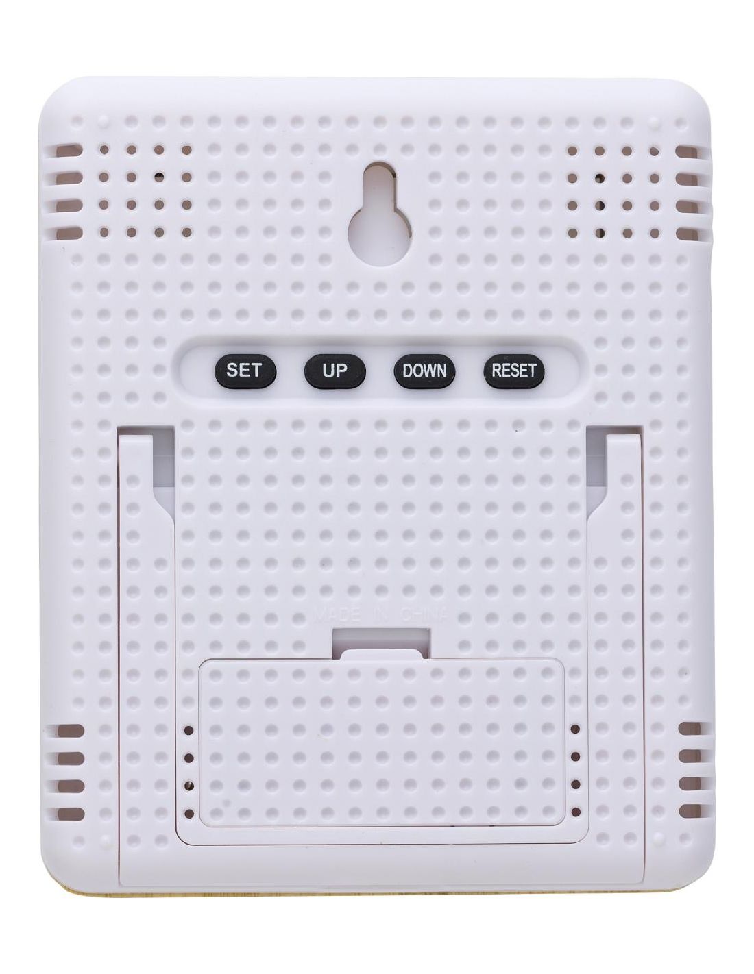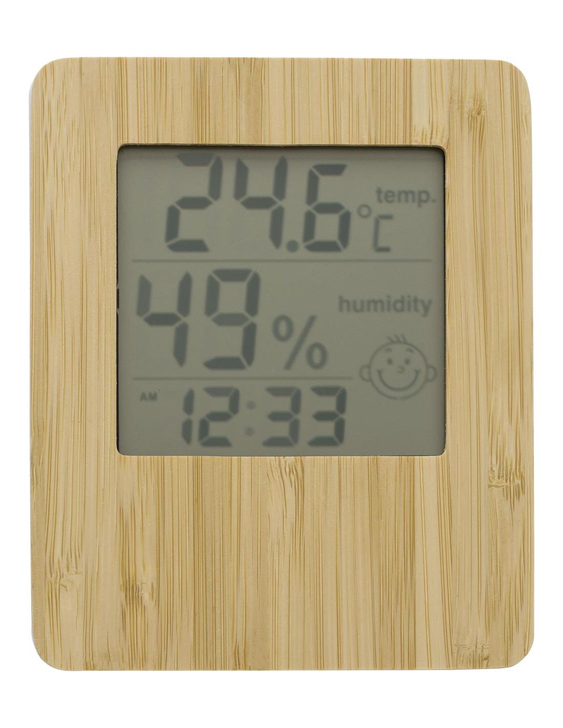 Estación meteorológica de bambú y ABS, con soporte plegable. Funciones: reloj, año, temperatura y humedad. Pilas incluidas.