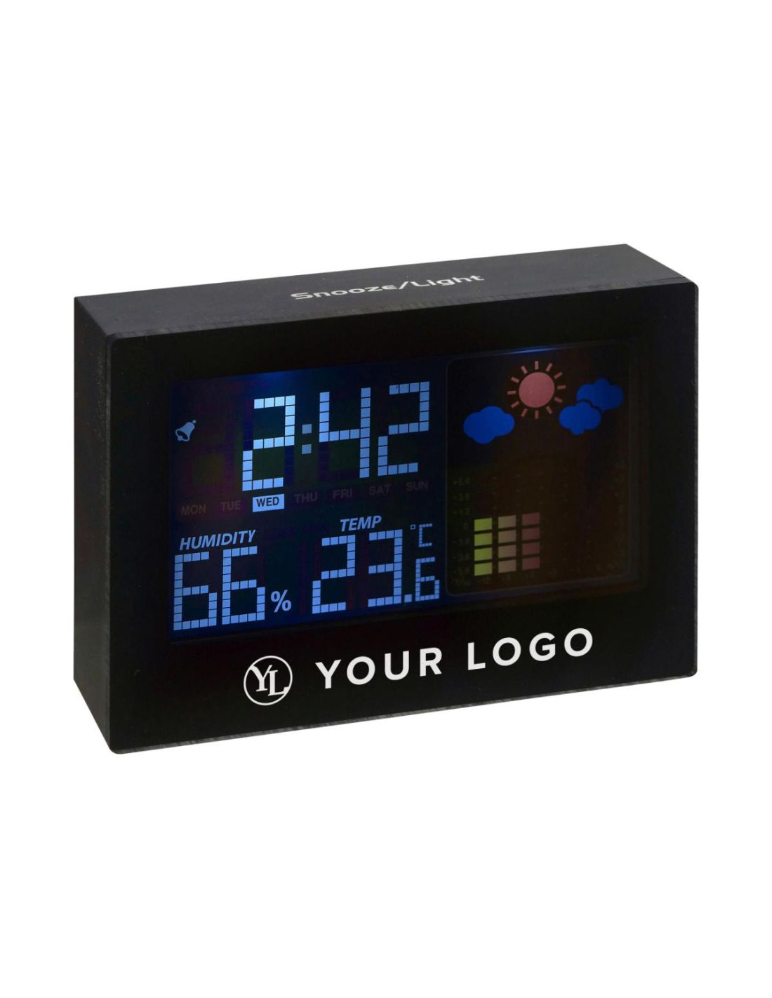 Estación meteorológica digital de plástico. Con reloj, alarma, calendario, higrómetro, termómetro y previsión del tiempo. Pilas incluidas.