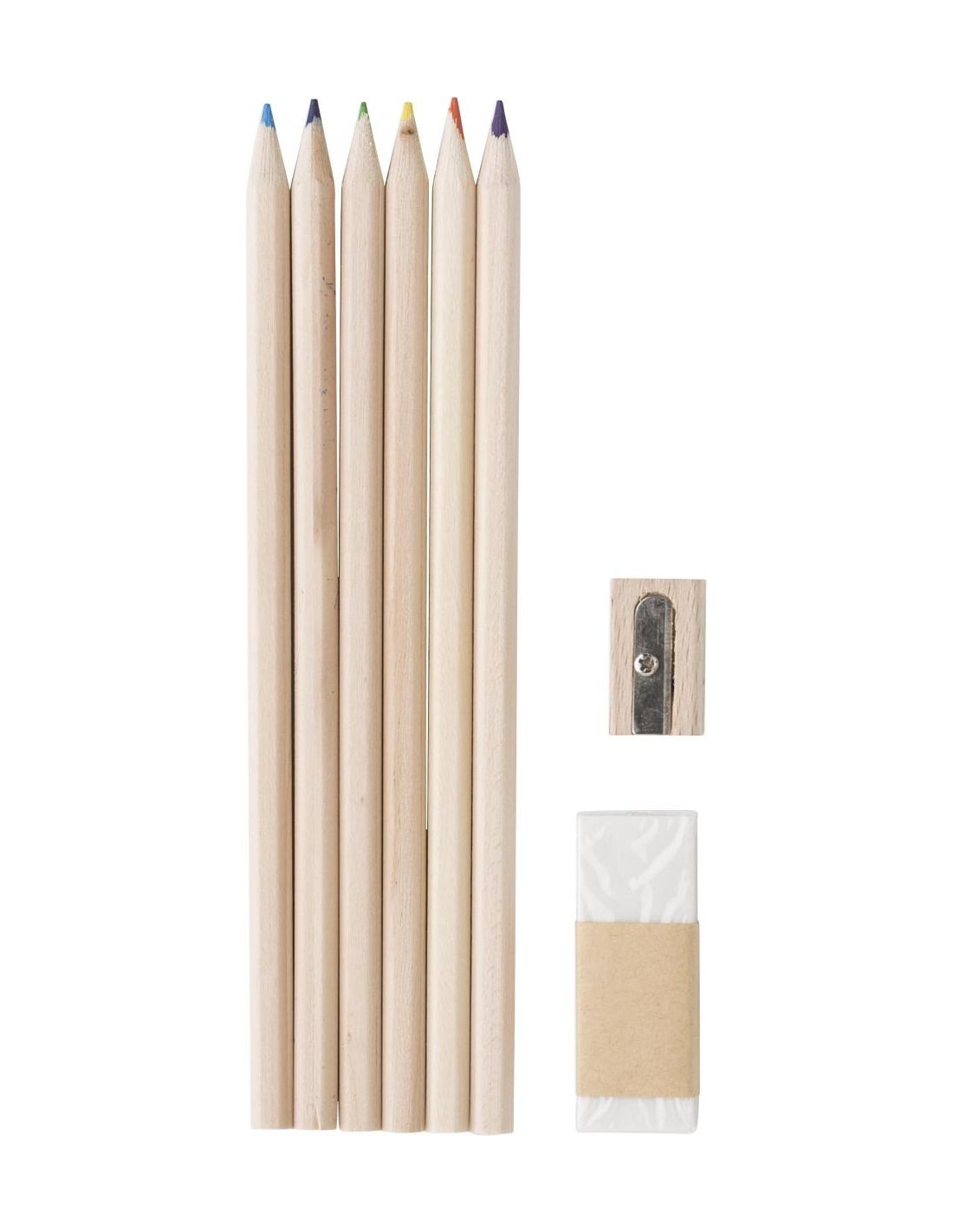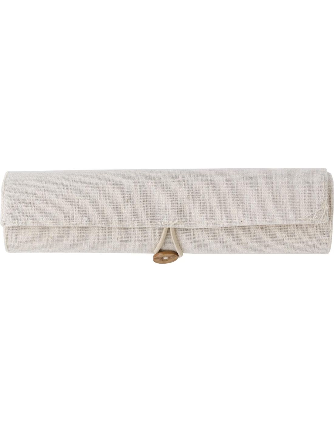 Estuche enrollable de lino y algodón con 6 lápices de colores, sacapuntas y goma de borrar. Colores de los lápices: azul royal, azul oscuro, verde, amarillo, naranja y morado.