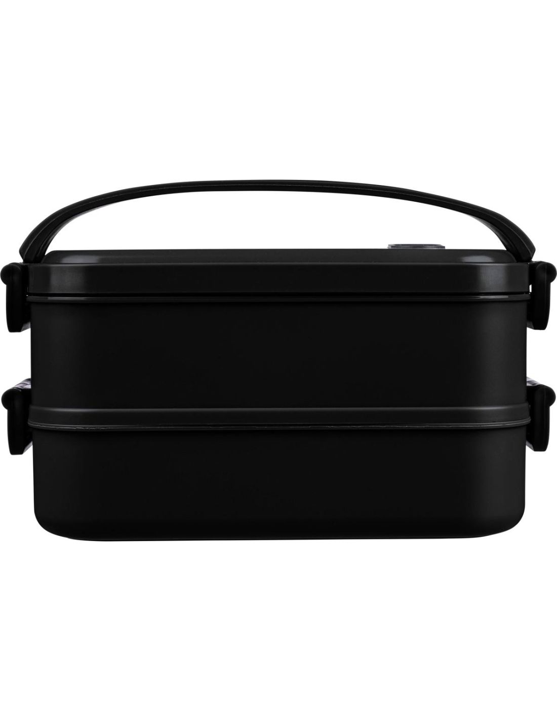 Fiambrera de PP con una capacidad total de 1600 ml, dividida en dos capas de 800 ml. Cuenta con una válvula de silicona para uso en el microondas, cierre con hebillas y asa de transporte de silicona. Presentada a granel.