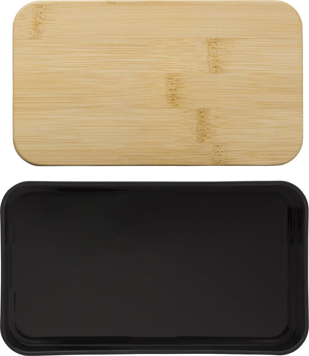 Fiambrera de PP de doble capa con 2 compartimentos (400 ml cada uno) y tapa de bambú. Incluye divisor, cubiertos de plástico (cuchara, tenedor y cuchillo), y banda elástica.
