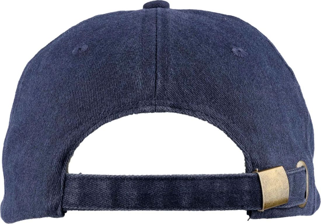 Gorra de algodón (240 g/m²) con efecto lavado, 5 paneles y visera de 7 cm. Cierre regulable con una hebilla de latón. Sin forro interior.