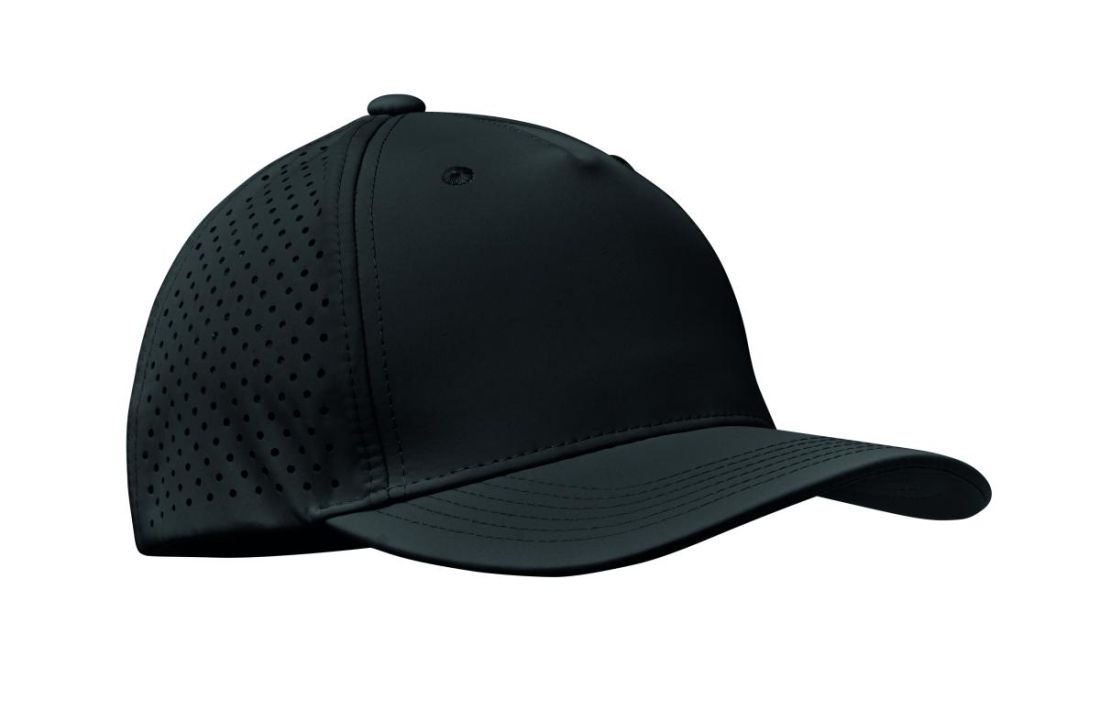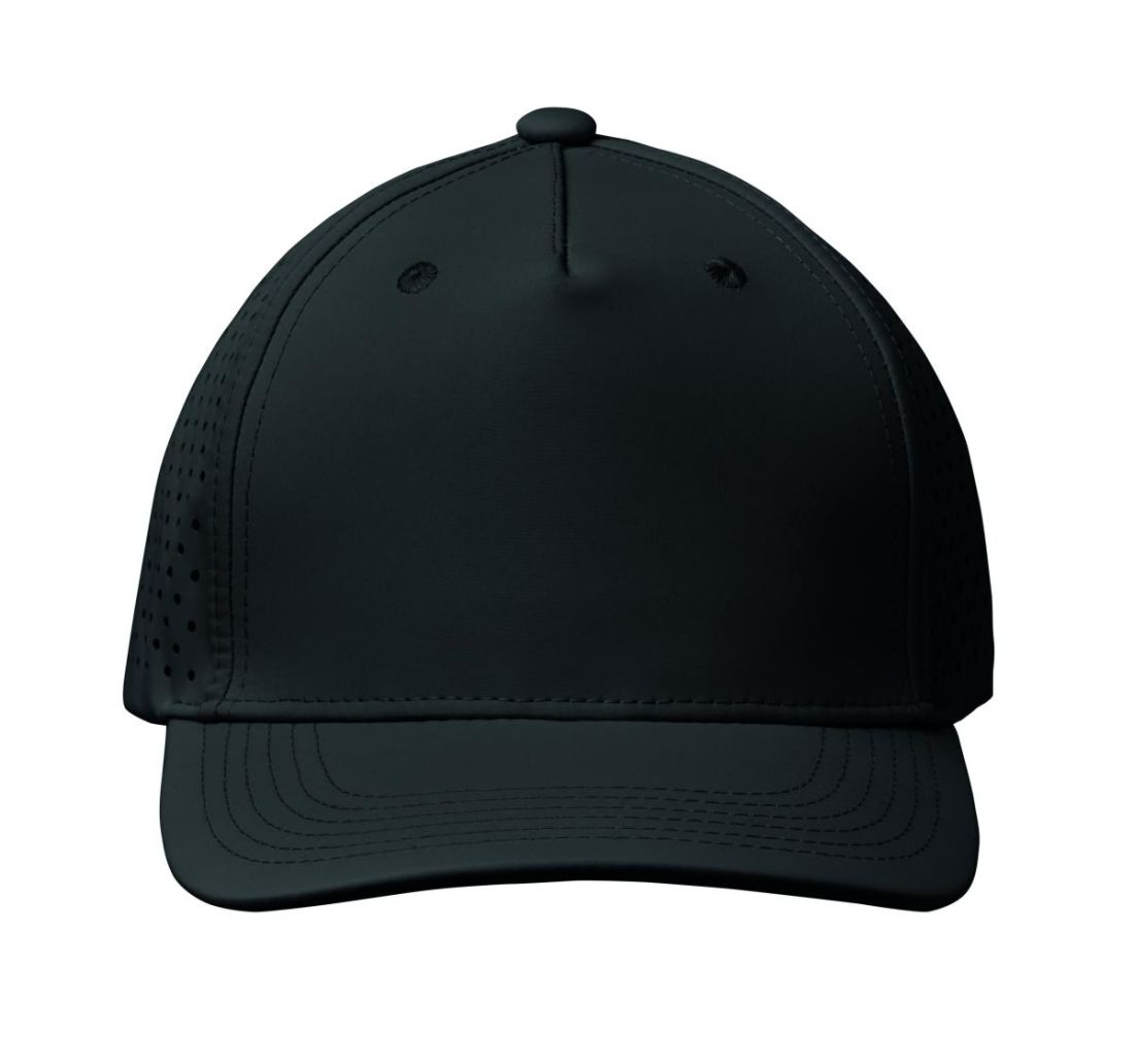 Gorra de poliéster 5 paneles con cierre de velcro ajustable y agujeros de ventilación. Con 2 ojales cosidos a juego. El artículo es de secado rápido, repelente al sudor y al agua. 130 gr/m².