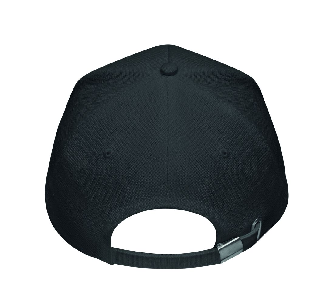 Gorra de béisbol de 5 paneles confeccionada en tejido de cáñamo 100% (370 g/m²) con cierre ajustable con hebilla metálica. 5 ojales cosidos en color a juego. Talla 7 1/4.