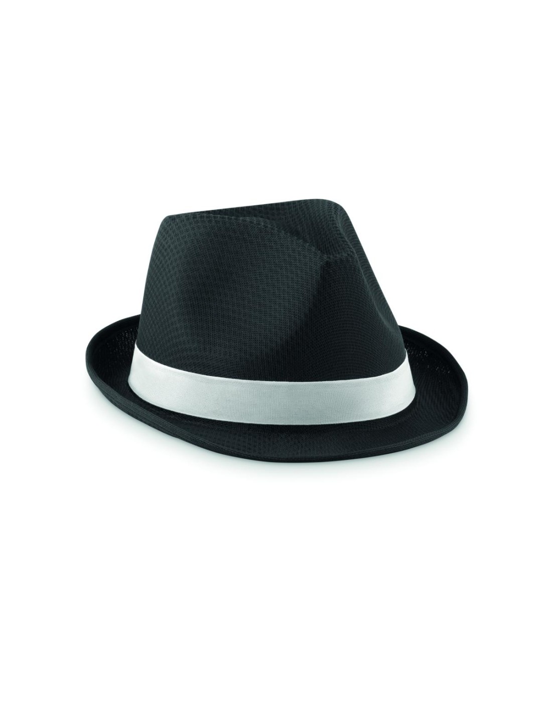 Sombrero de poliéster imitación paja de diferentes colores con cinta de poliéster en color blanco. En los pedidos sin impresión, las cintas se servirán sueltas y separadas del sombrero.