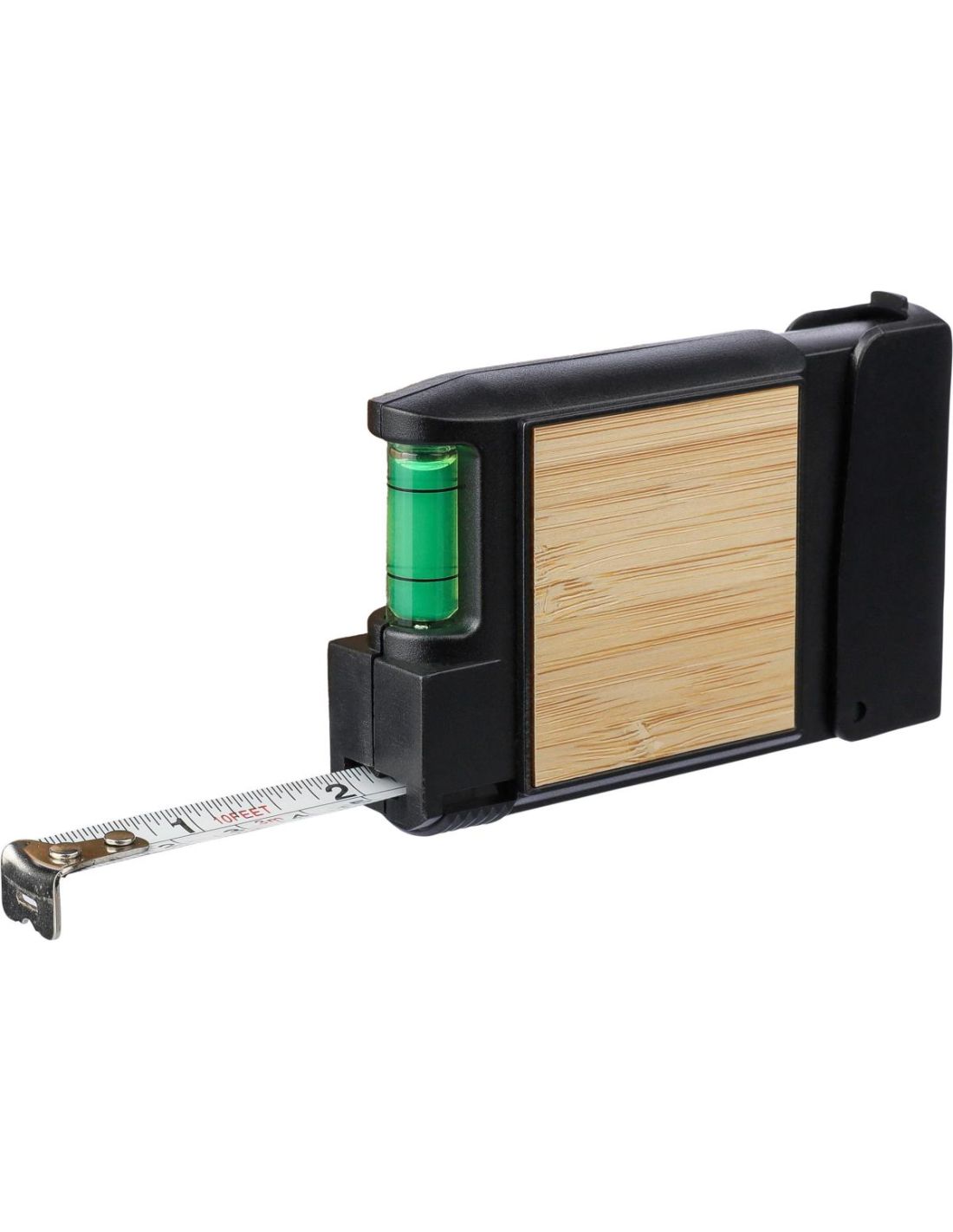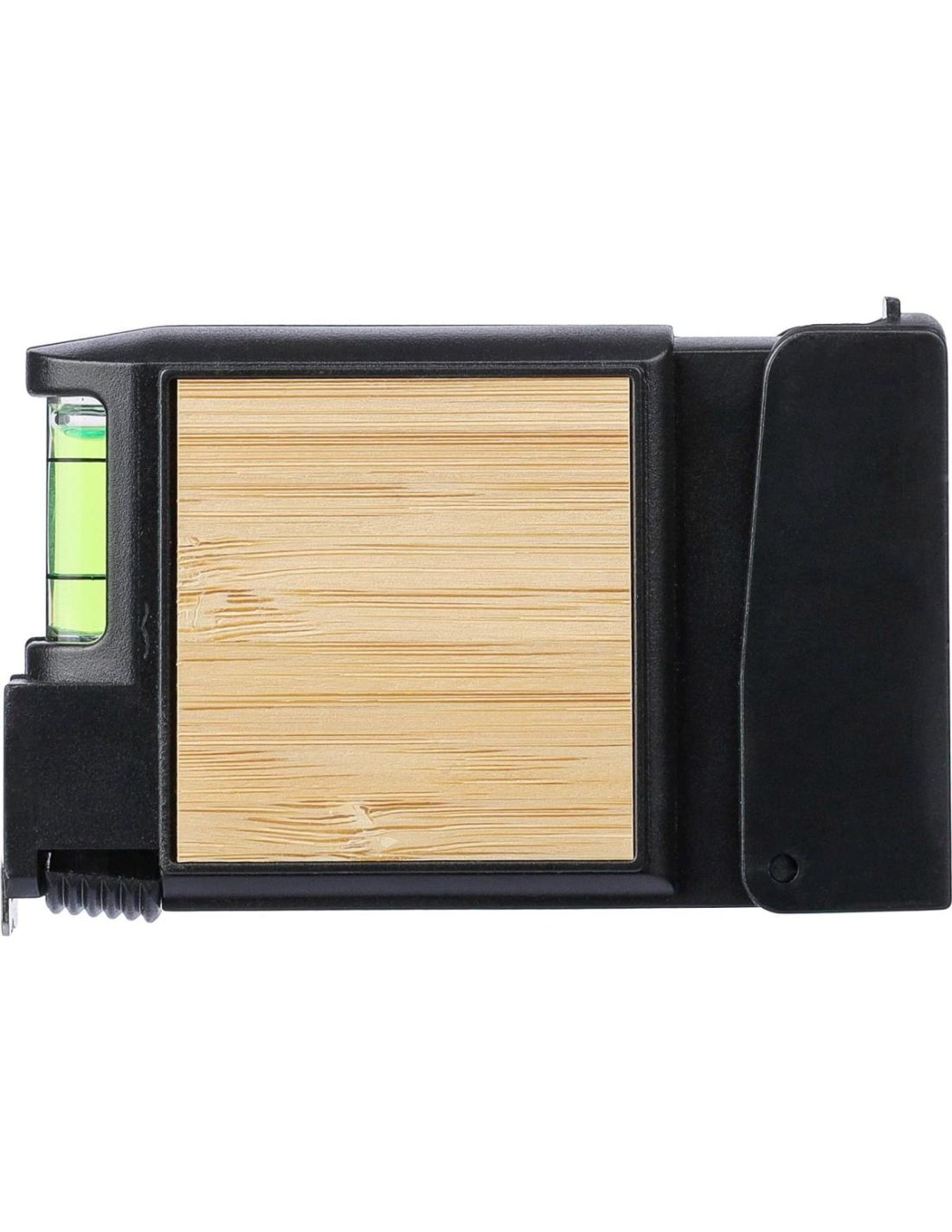 Nivel con detalles de bambú y cinta métrica de ABS. Longitud de 3 metros. Incluye 5 puntas para usar el artículo como destornillador y una herramienta metálica para quitar restos de 12 mm. Presentada en una caja de cartón marrón.