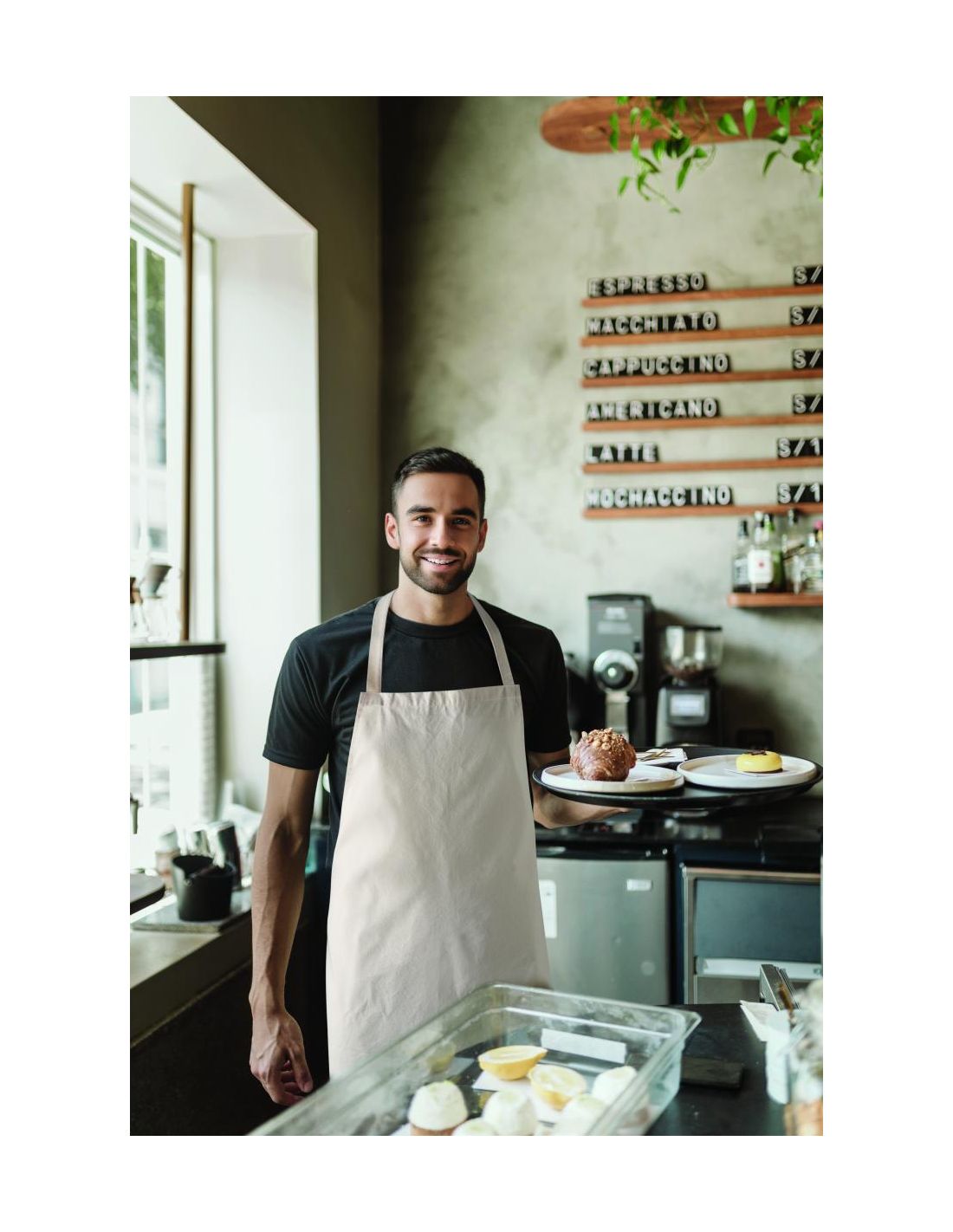 Delantal de algodón reciclado preconsumo de 180 gr/m² (70% algodón reciclado y 30% poliéster RPET) .Este artículo podría encoger después de la impresión.