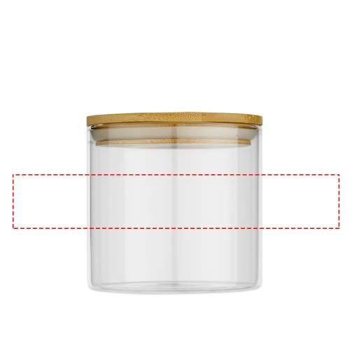 Recipiente para alimentos de tamaño pequeño fabricado en vidrio con tapa de bambú. Combina las ventajas del vidrio, que es un material resistente y duradero, con las cualidades renovables del bambú. El recipiente de vidrio (sin tapa) es apto para microondas y lavavajillas. Se presenta en una caja de papel kraft reciclado. Capacidad: 320 ml.