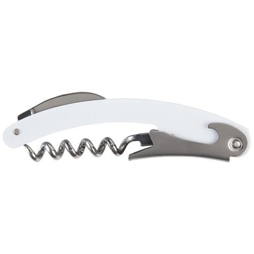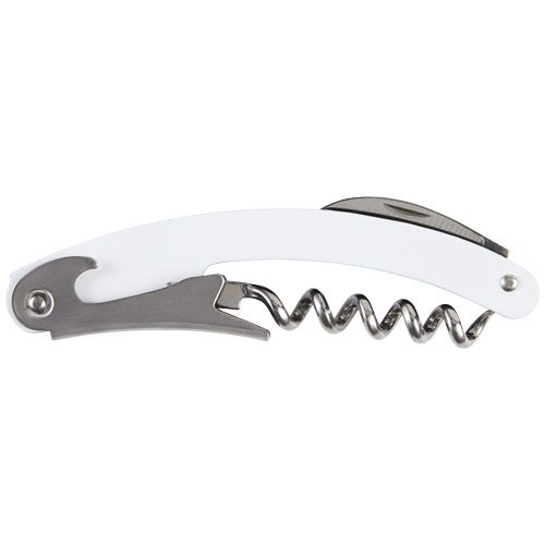 Una herramienta profesional de acero inoxidable con cuerpo de color, cortacápsulas y abrebotellas.