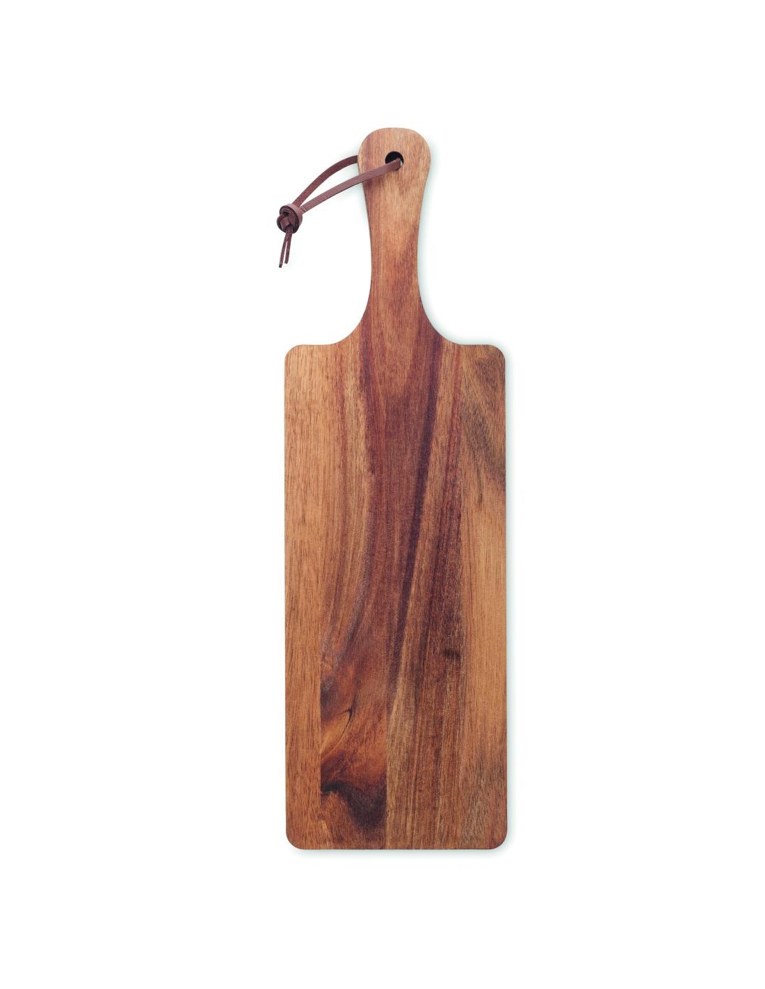 Tabla de servir de madera de acacia con asa y cordón de PU. La madera es un material natural, el color del articulo puede variar de unas piezas a o…
