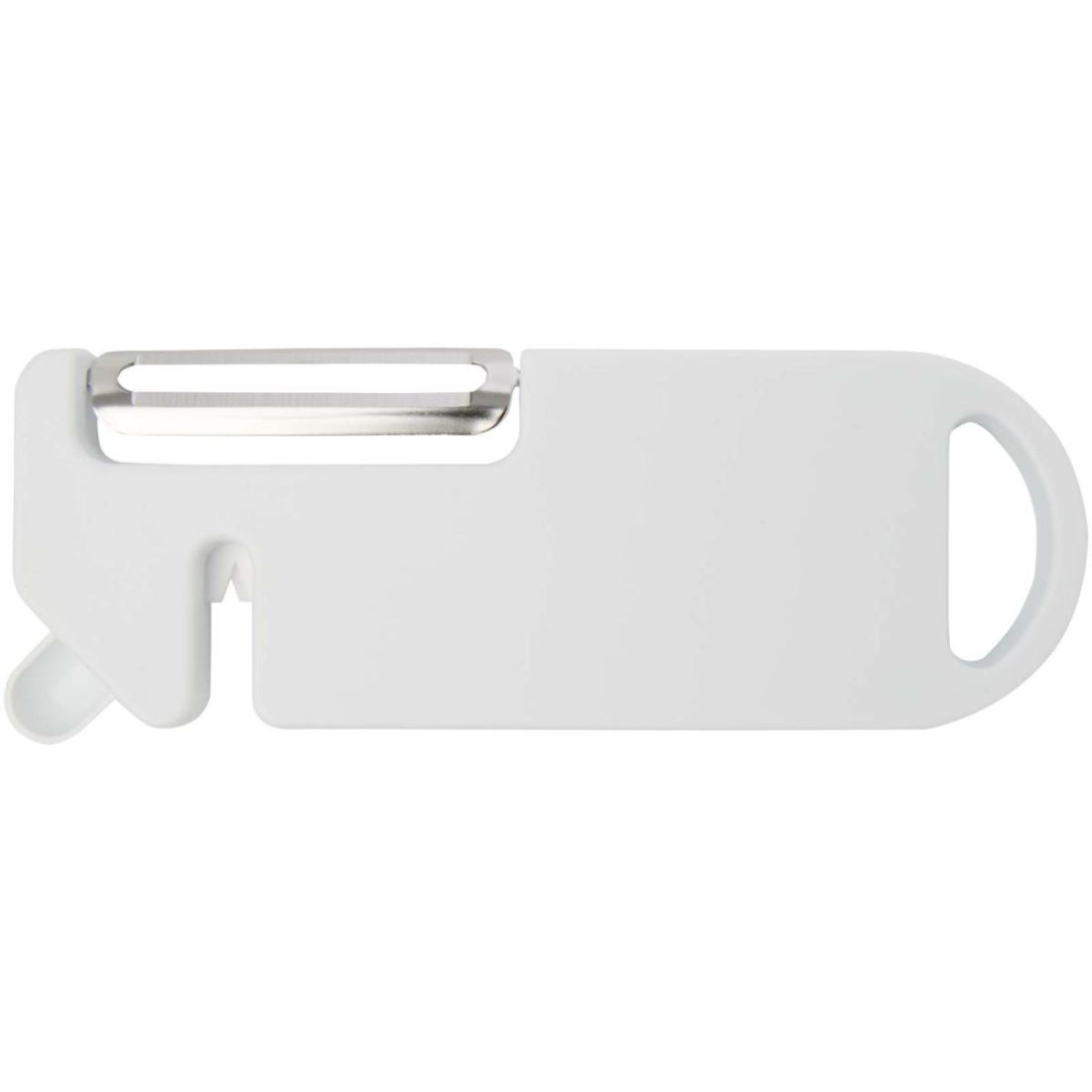 Este utensilio de cocina multiusos combina cuatro funciones esenciales en un diseño compacto. Fabricado con plástico reciclado, cuenta con pelador, abridor de botellas, afilador de cuchillos y una punta puntiaguda para eliminar las marcas de las patatas. Cuenta con un orificio para colgar que permite guardarlo fácilmente. Práctico y compacto, es un utensilio versátil que no puede faltar en casa.