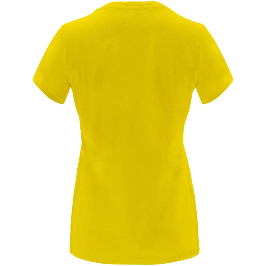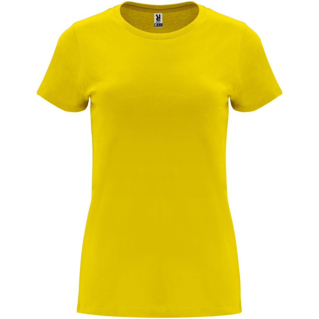 Camiseta de manga corta entallada para mujer. Cuello redondo en canalé 1x1 con cubrecosturas en el cuello. Etiqueta extraíble.