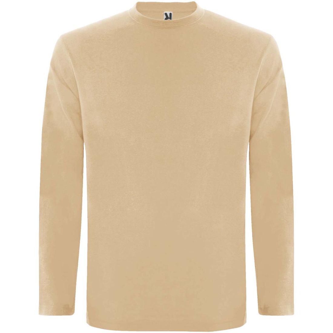 Camiseta de manga larga, tejido tubular y cuello redondo de 4 capas. Cubrecosturas de refuerzo en cuello y hombro. Sin puños. Etiqueta extraíble. Diseño tubular en tallas de adultos, costuras laterales en talla infantil. El modelo mide 185 cms y lleva la talla L.