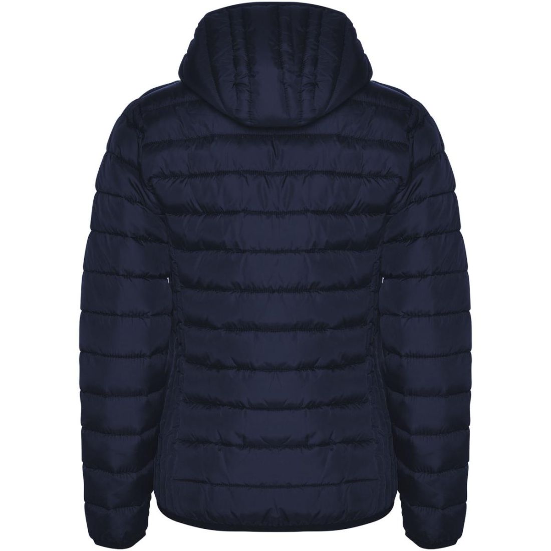 Chaqueta de mujer acolchada con relleno tacto pluma y capucha fija. Cremalleras invertidas con protector de barbilla a juego. Dos bolsillos laterales con cremallera. Ribete elástico a tono en puños, bajos y capucha. Forro interior a contraste. Prenda ligera y plegable. Resistente al agua. Modelo a prueba de viento.