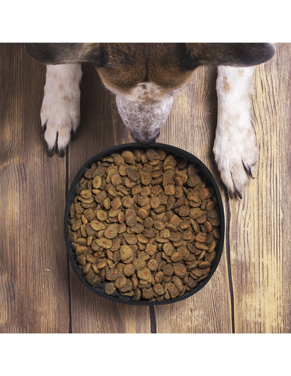 Bowl plegable para mascotas de 1,3l de capacidad, con exterior en resistente papel reciclado laminado de 270g/m2. Interior en poliéster RPET,...