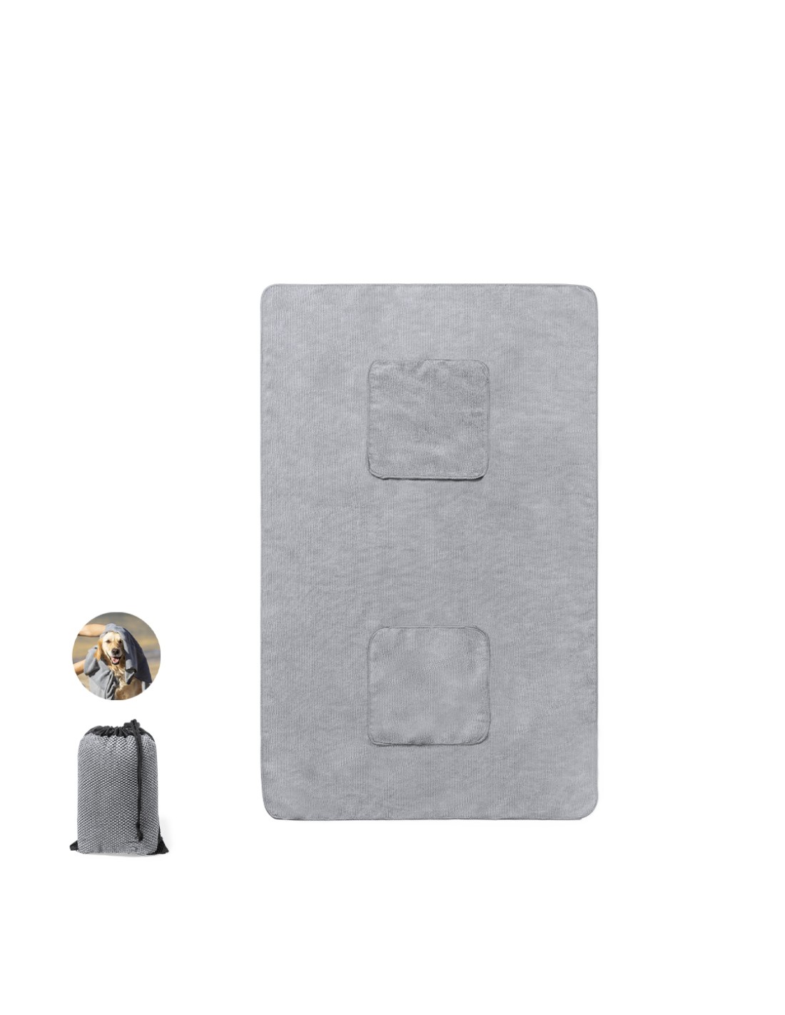 Toalla para mascotas fabricada en resistente poliéster de 160g/m2. Medida 66 x 106 cm, con dos prácticos bolsillos para las manos, facilitando así el secado de la mascota. Presentación en funda individual de redecilla con cierre de cordón y ajustador.