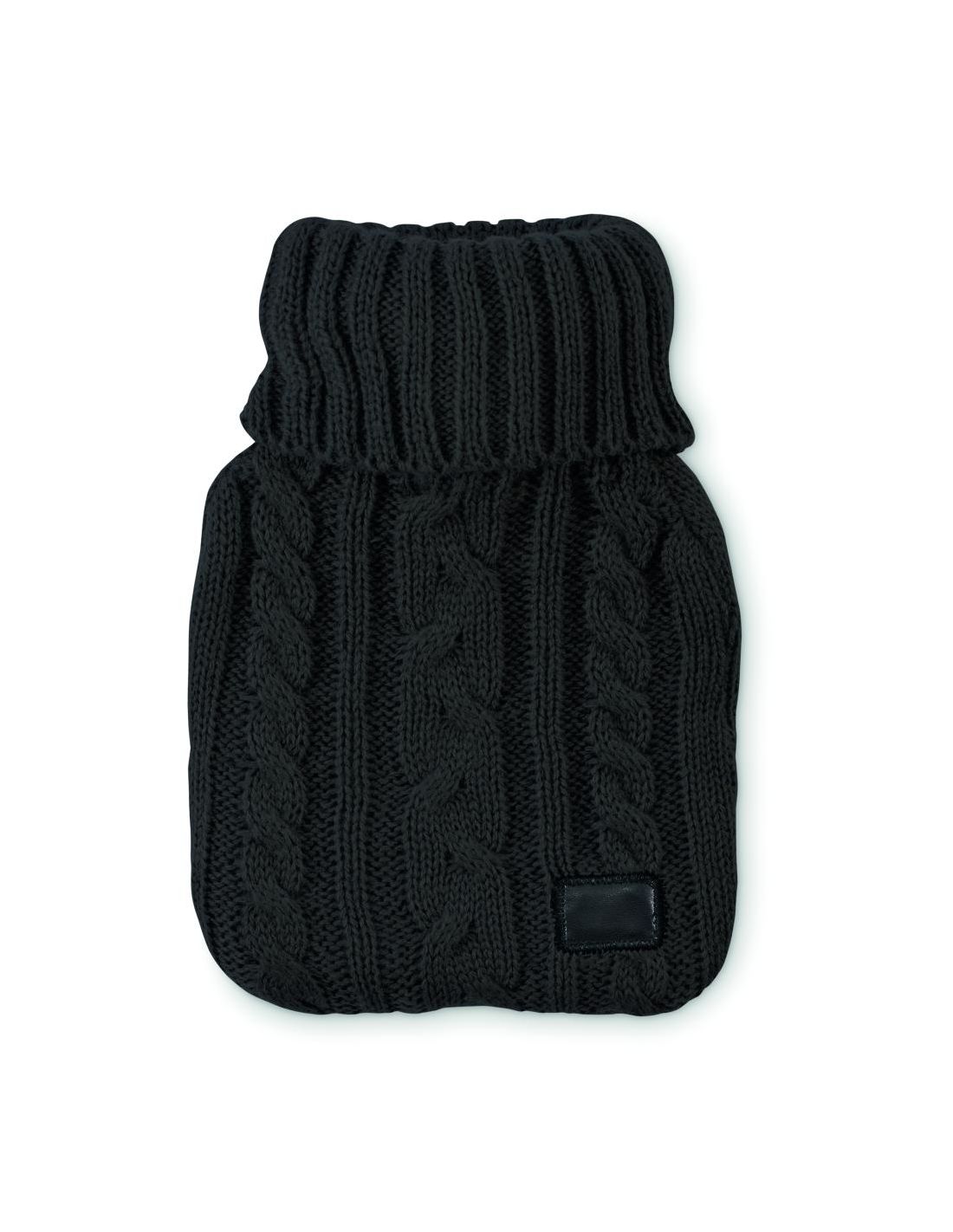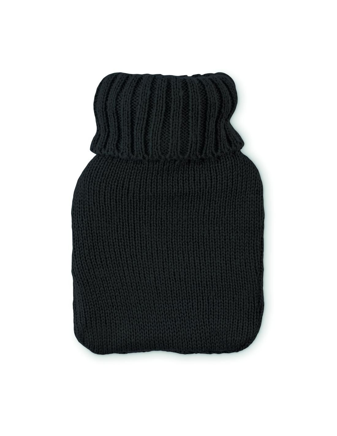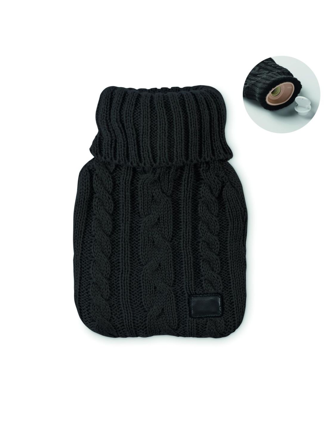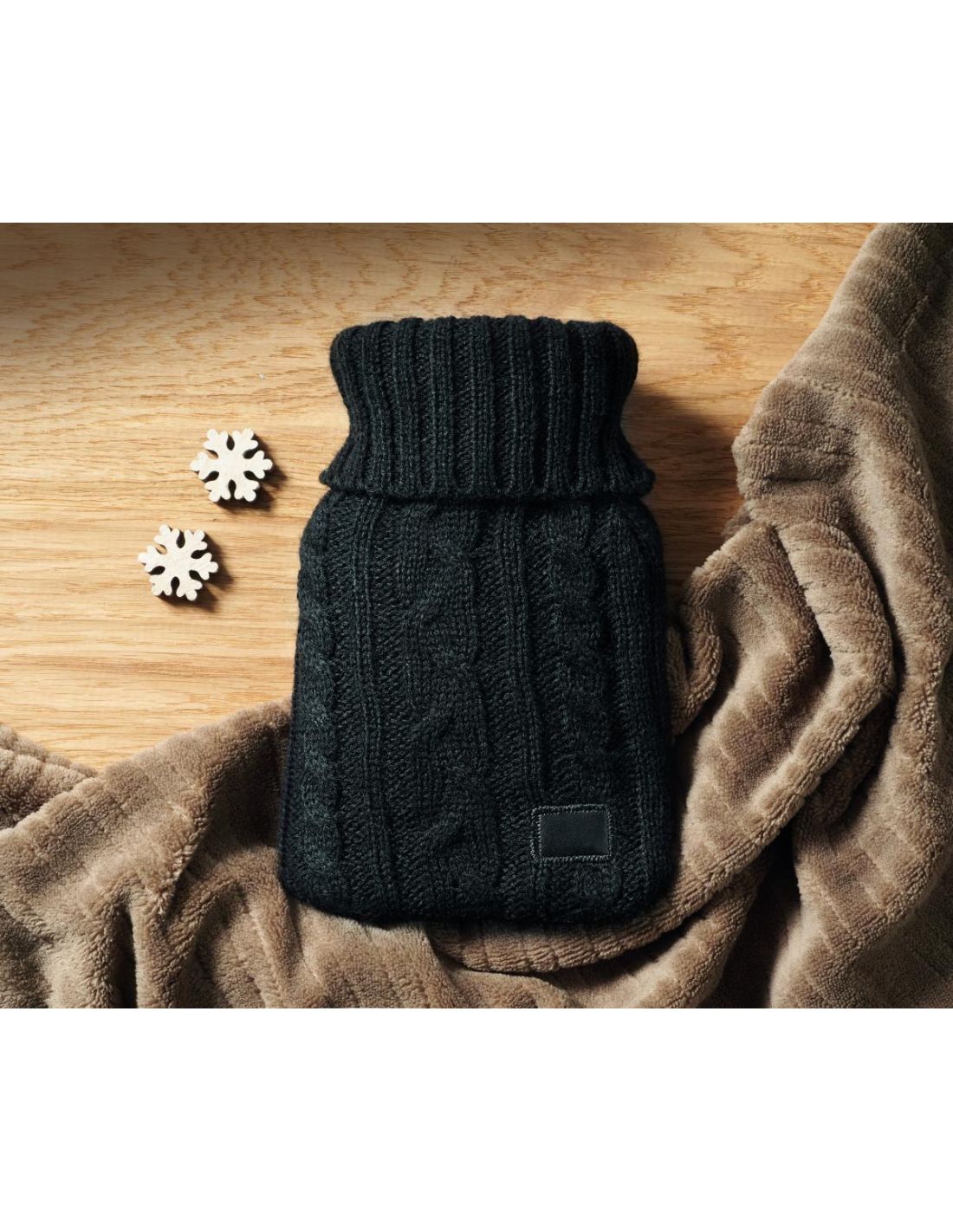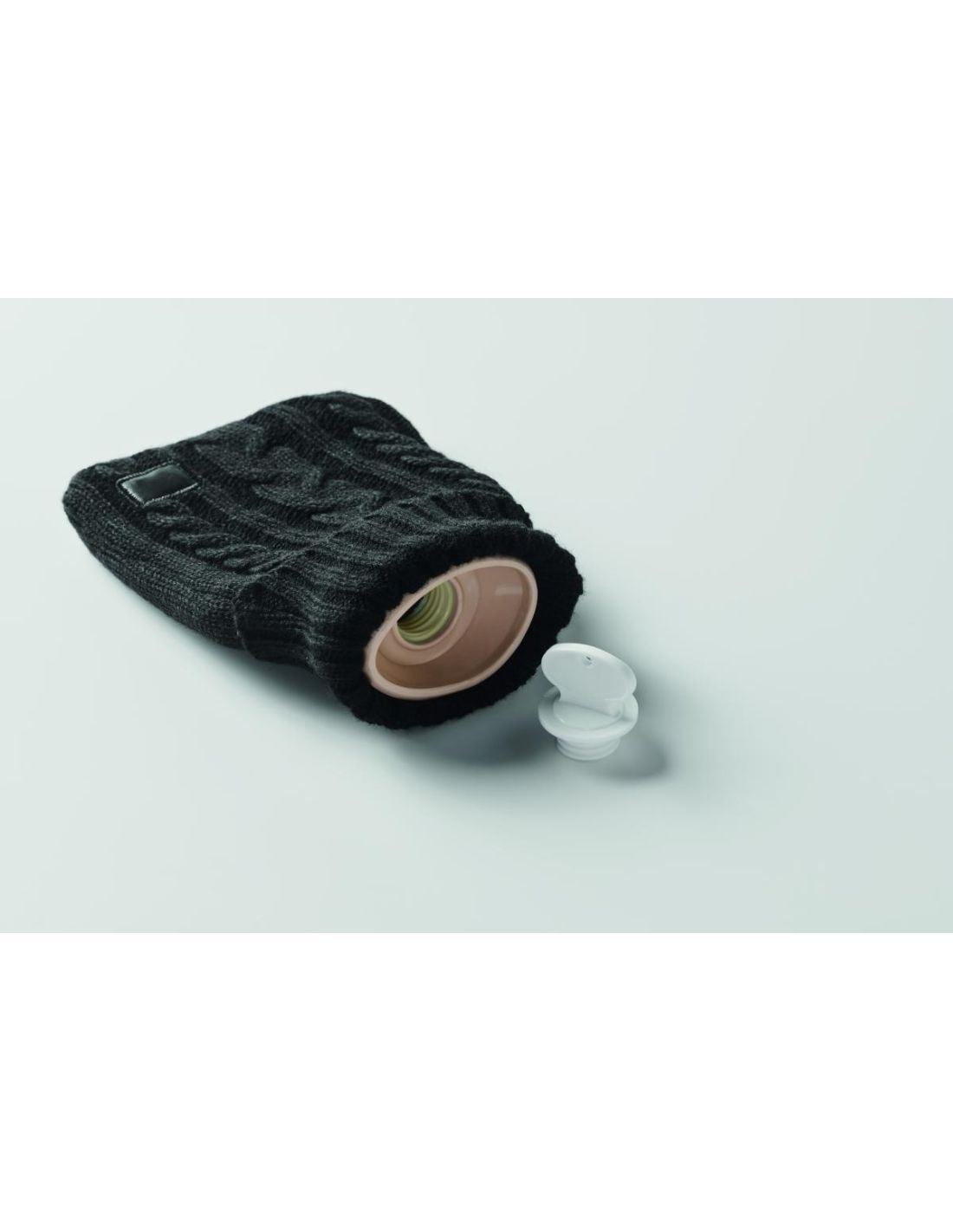 Bolsa de agua caliente con funda acrílica de punto con etiqueta de PU. Se utiliza para dar calor, normalmente en la cama, pero también para aplicar calor en una parte específica del cuerpo. Capacidad: 450 ml.