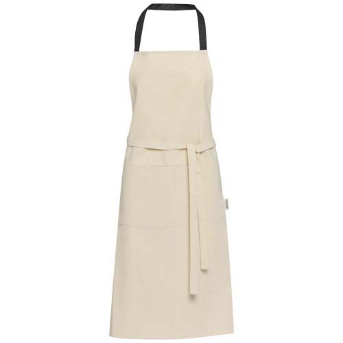 El delantal está confeccionado en algodón reciclado 100 % de 200 g/m² con certificado GRS. Con su color de algodón natural y su lazada en contraste al cuello, este delantal protege la ropa al cocinar. Con dos bolsillos incluidos, de un tamaño combinado de 45 x 20 cm y un cierre de lazo de 1 metro de largo, el delantal garantiza la practicidad y el estilo en las tareas de cocina.