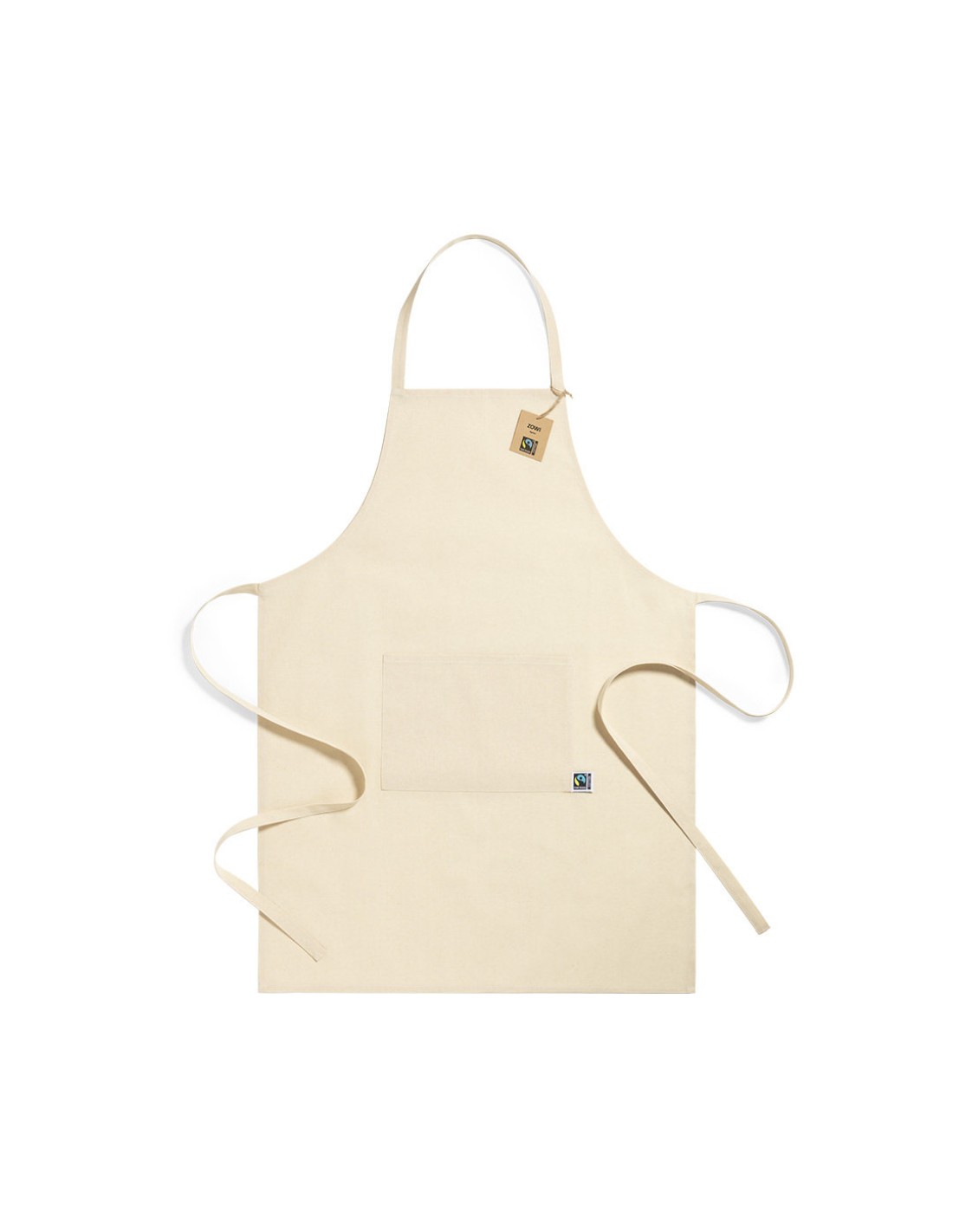 Delantal de línea nature, fabricado en 100% algodón de 180g/m2 en tono natural. Con certificación Fairtrade (Comercio Justo) un sistema comercial solidario y alternativo al convencional que persigue el desarrollo de los pueblos y la lucha contra la pobreza. Con bolsillo frontal y cintas de ajuste, de corte por debajo de la rodilla. Incluida etiqueta Fairtrade y hangtag distintivo en cartón reciclado.