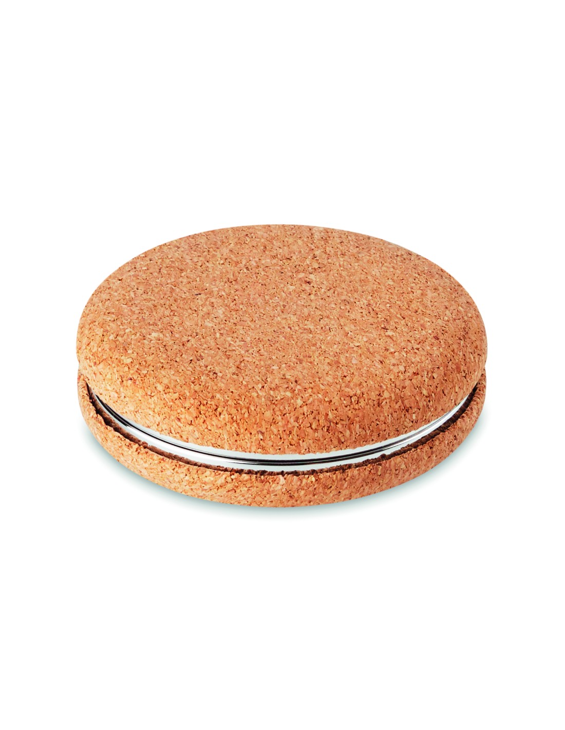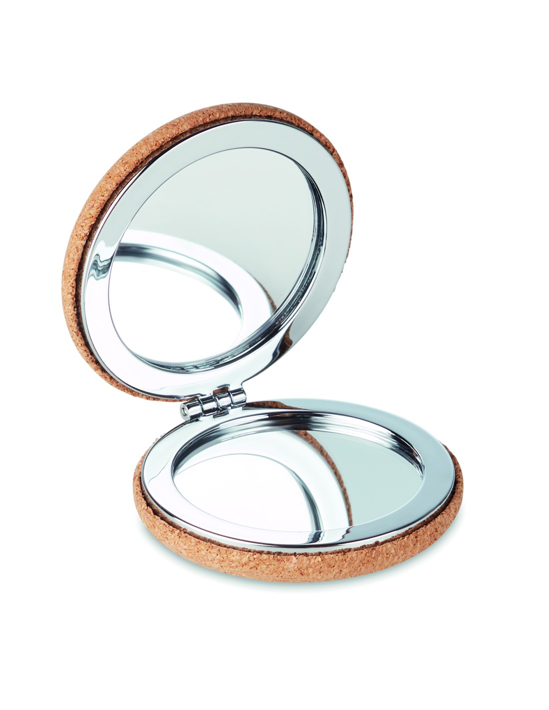 Espejo doble circular con acabado en corcho. El corcho es un material natural, debido a su naturaleza estructural y porosidad superficial, el resultado final de la impresión por artículo puede tener desviaciones.