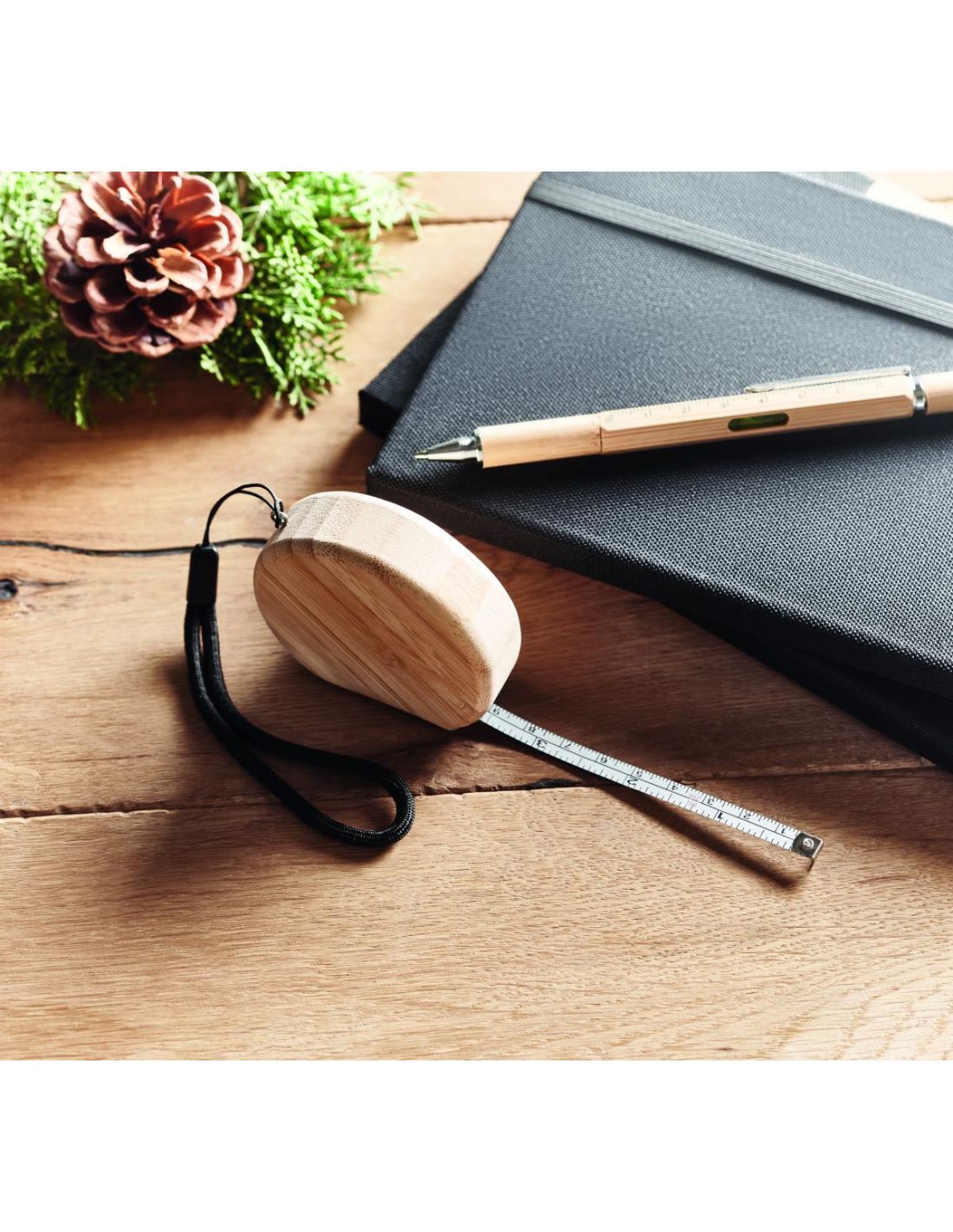Cinta métrica cuadrada con carcasa de bambú de 2M con correa para la muñeca. Una herramienta útil para tomar medidas con un toque natural gracias a la carcasa de bambú. El bambú es un material natural, el color del articulo, la medida y la impresión sobre el puede variar. FSC®-certified | FSC 100%, N5.7, FSC-C213206