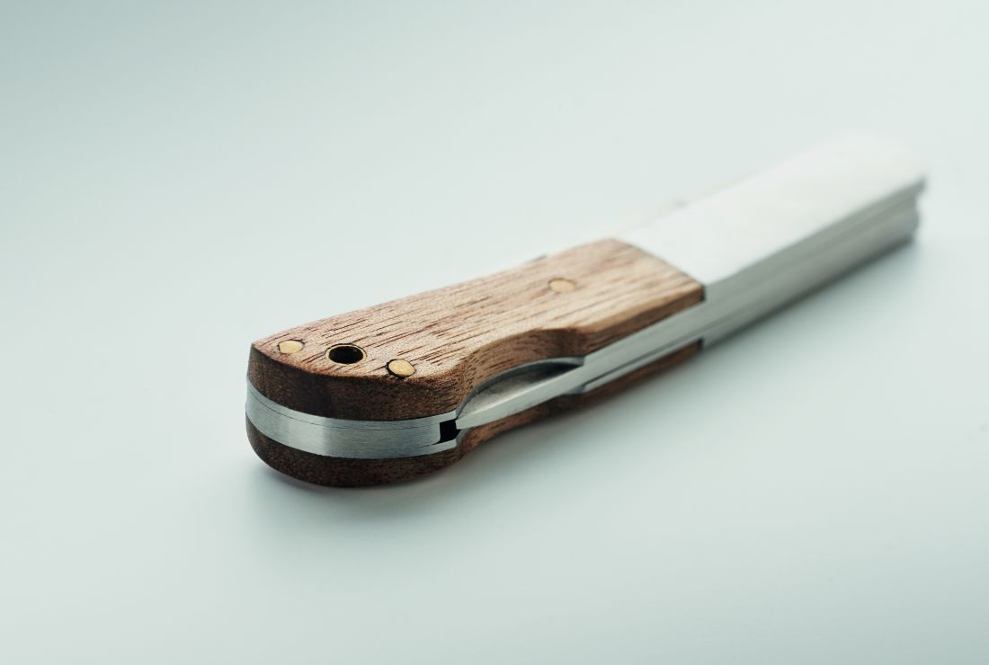 Navaja plegable de acero inoxidable con mango de madera de acacia.