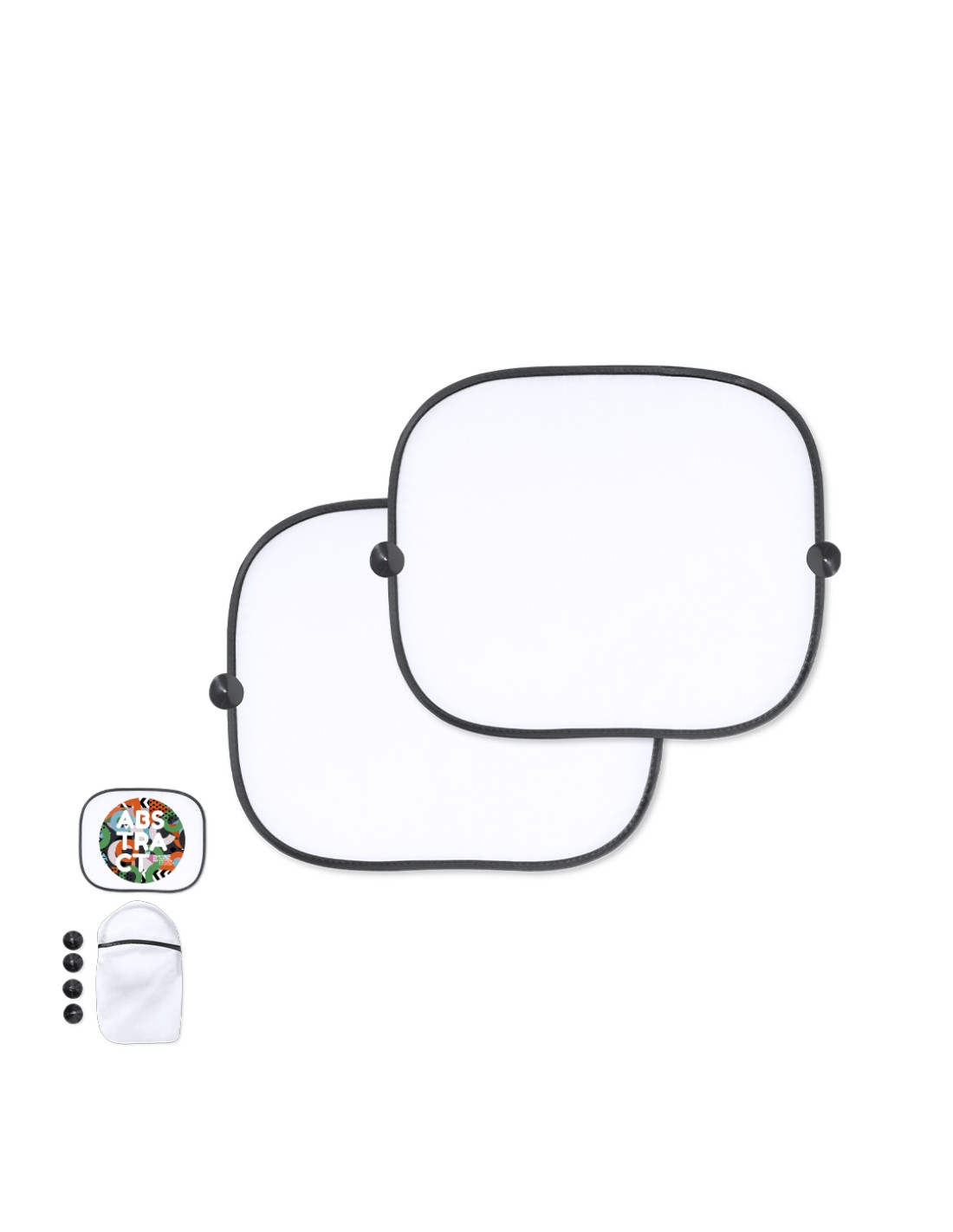 Original set de 2 parasoles plegables para ventanilla, fabricados en resistente poliéster. Ligeros y en medidas 44 x 36 cm cada uno, con ribetes reforzados y fijación por ventosas (4 unidades incluidas). Con sencillo sistema de plegado y funda individual a juego. Color blanco especial para sublimación.
