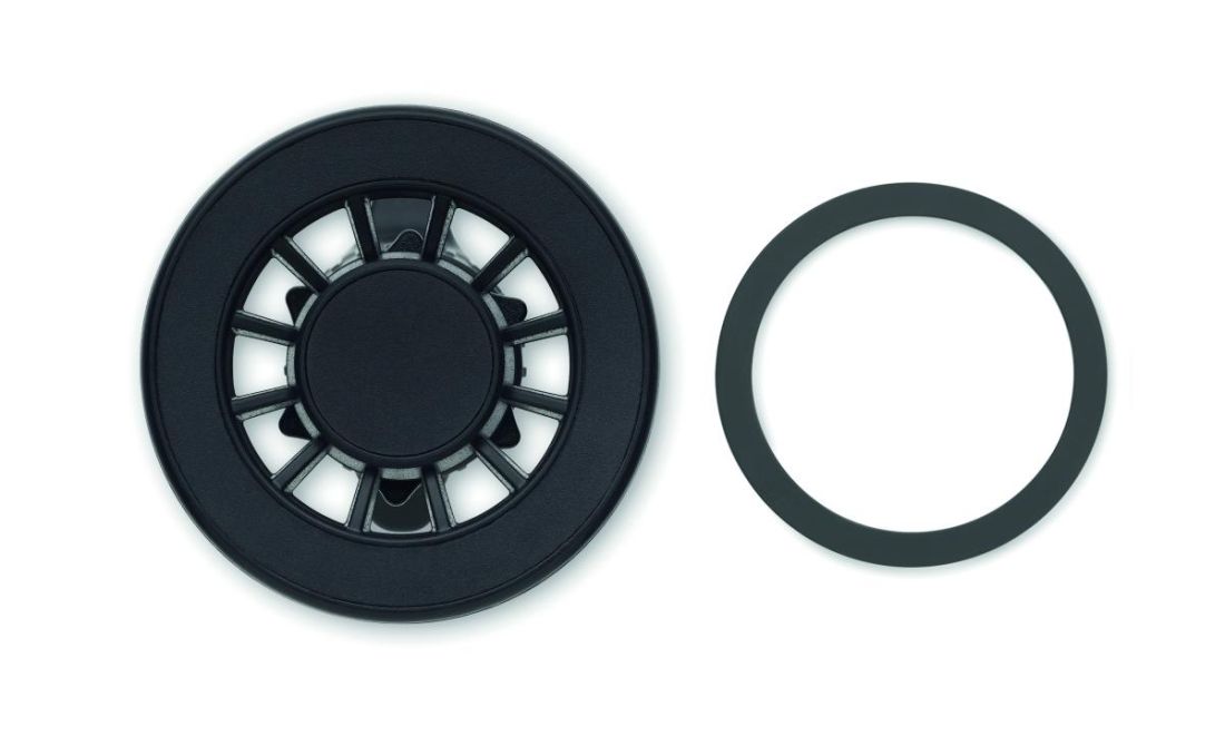 Soporte magnético para teléfono en ABS con rotación 360 grados. Incluye un anillo metálico magnético adicional para cargar teléfonos inalámbricos no magnéticos.